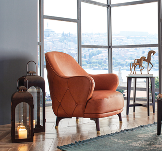 Supreme Comfort Dignified in Details. Featuring aesthetic and supreme comfort design features of contemporary living spaces and impressive materials and colour combinations together, the Navona Living Room brings a contemporary, chic and flamboyant decoration style to living spaces. Standing out with its velvet and leather-look fabric alternatives and striking colour usage, the Navona Living Room creates sophisticated details with its special stitching details on the back and arms and the wooden leg design with brass shoes.