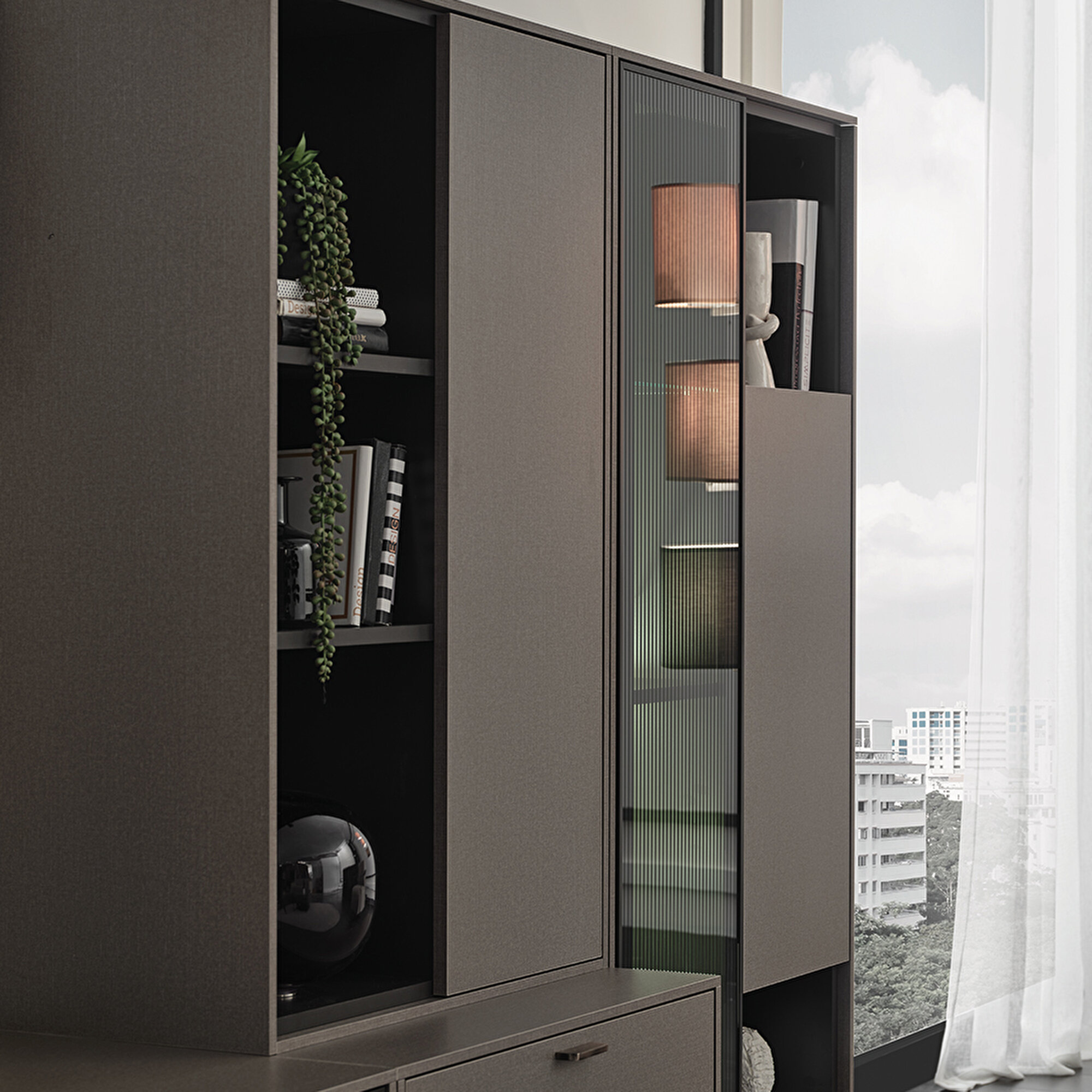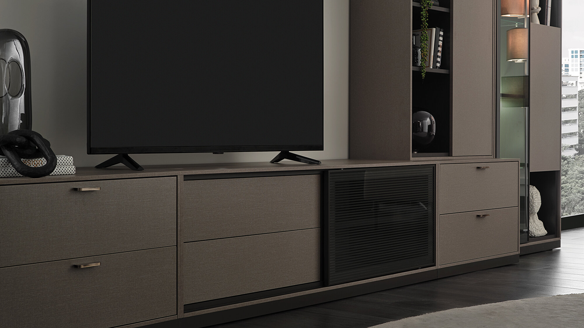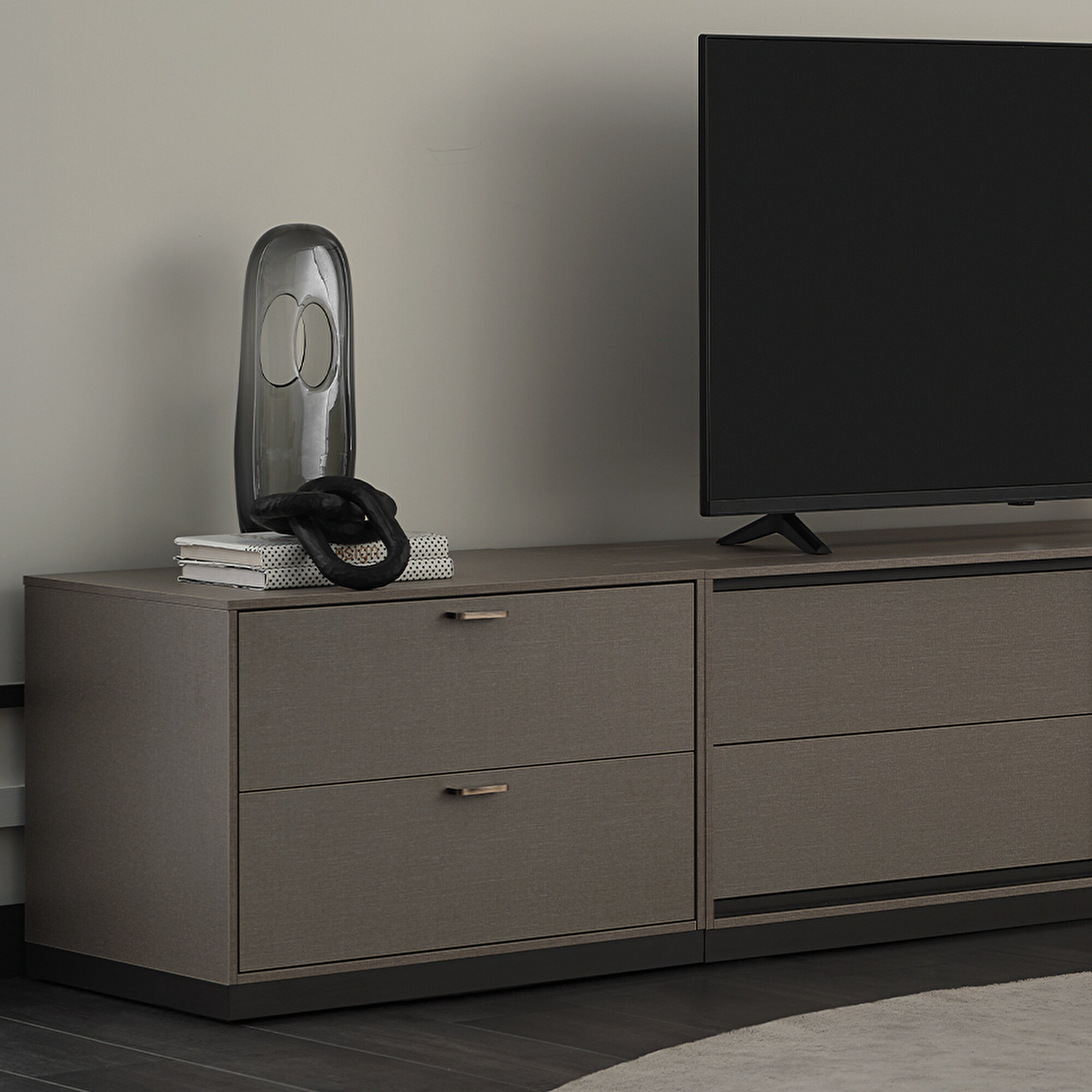 Qualified detailsSophisticated and modern styleContemporary lookTextile textured surface coating enriched with metal effects exclusive to EnzaNatural color glass applicationSliding door application on the TV stand with basePush-to-open mechanism