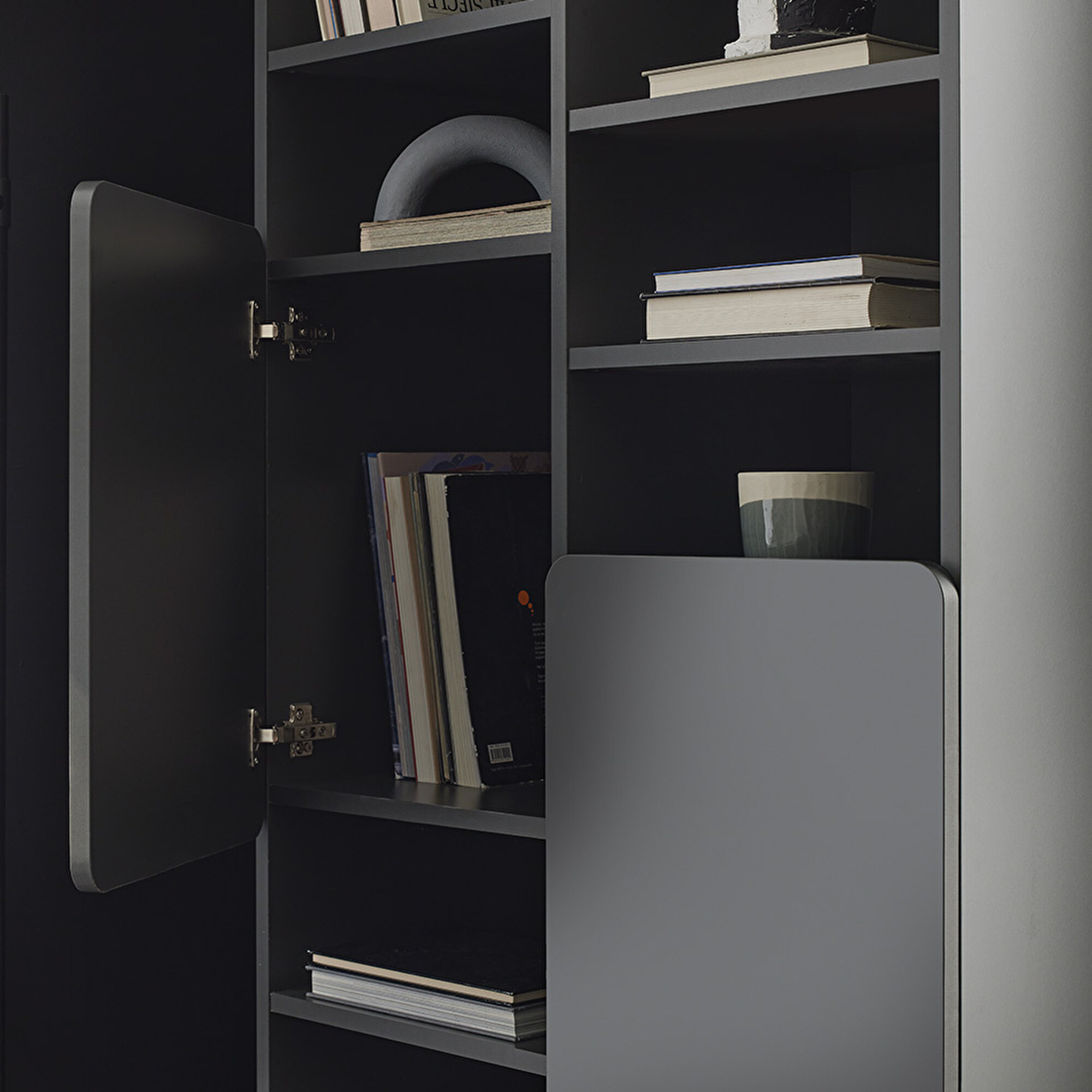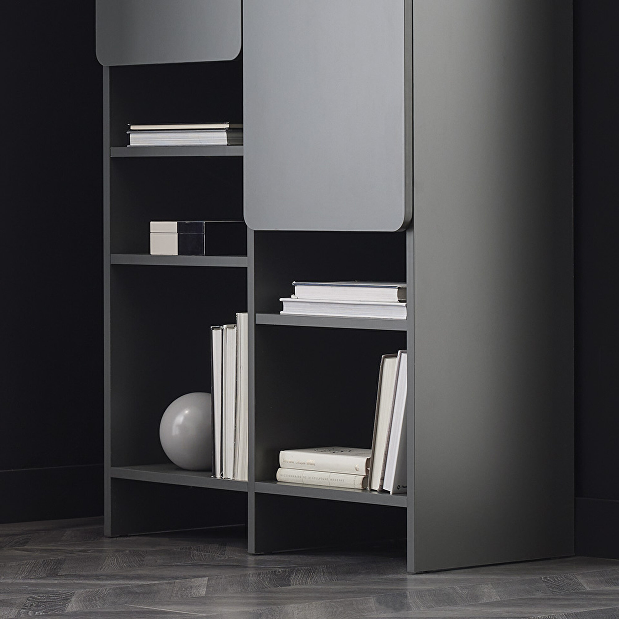 Dark Gray Surfaces Standing out with its selection of quality materials, BLEND BOOKCASE combines accessibility with a high aesthetic understanding. BLEND BOOKSHELF combines its dark gray color with its durable surface structure and provides long-lasting use.