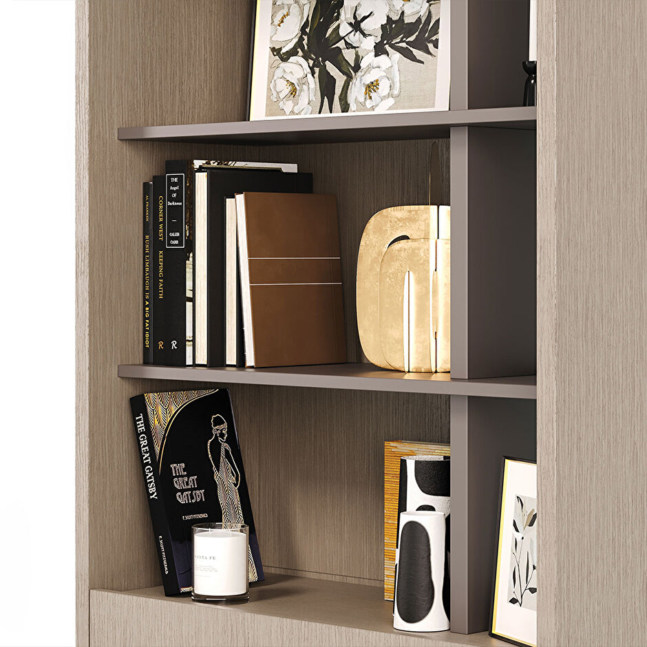 Natural Color and Design Details BOSTON BOOKCASE, which emphasizes naturalness with its colors, finds its place in natural design applications. The bookcase, which has a natural wood color, draws attention with its wooden veneer details.