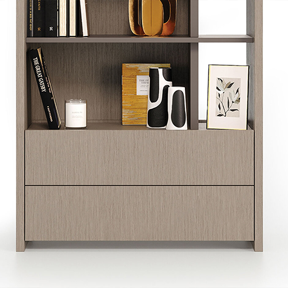 Practical Use The BOSTON BOOKSHELF module combines simplicity and practicality with its handleless design. The module provides ample storage space with two drawers.