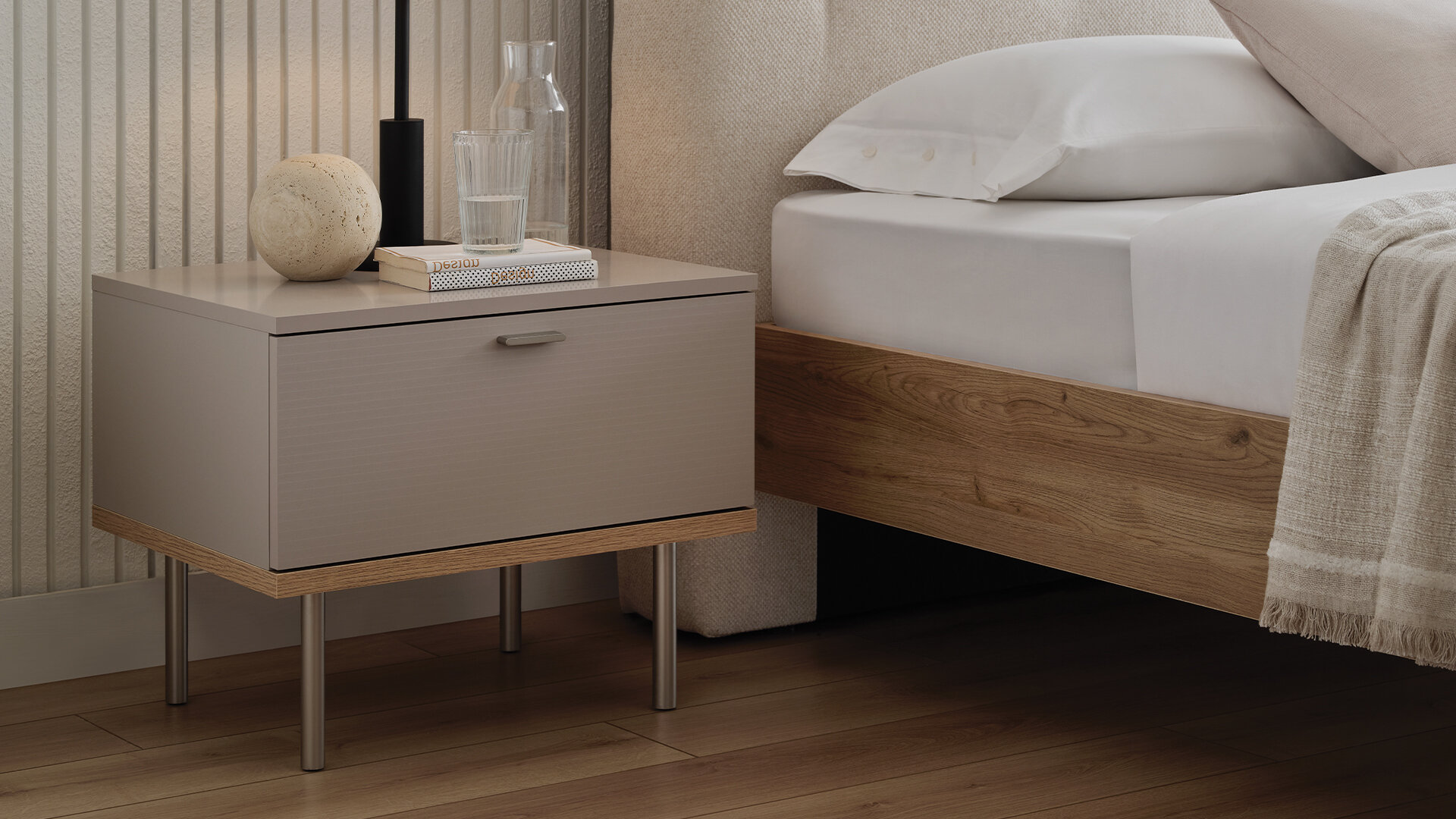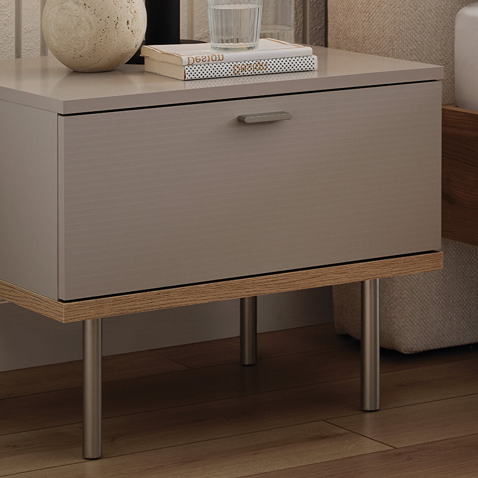 CANTE NIGHTSTAND adds a modern atmosphere to your bedroom with its minimalist design and elegant details. The peaceful harmony of natural oak and beige colors brings warmth and calmness to your room, while the special striped textures on the doors provide a sophisticated depth to the design. One large drawer allows you to keep your belongings organized, while the inox metal handle and leg design adds a modern touch to its elegance.