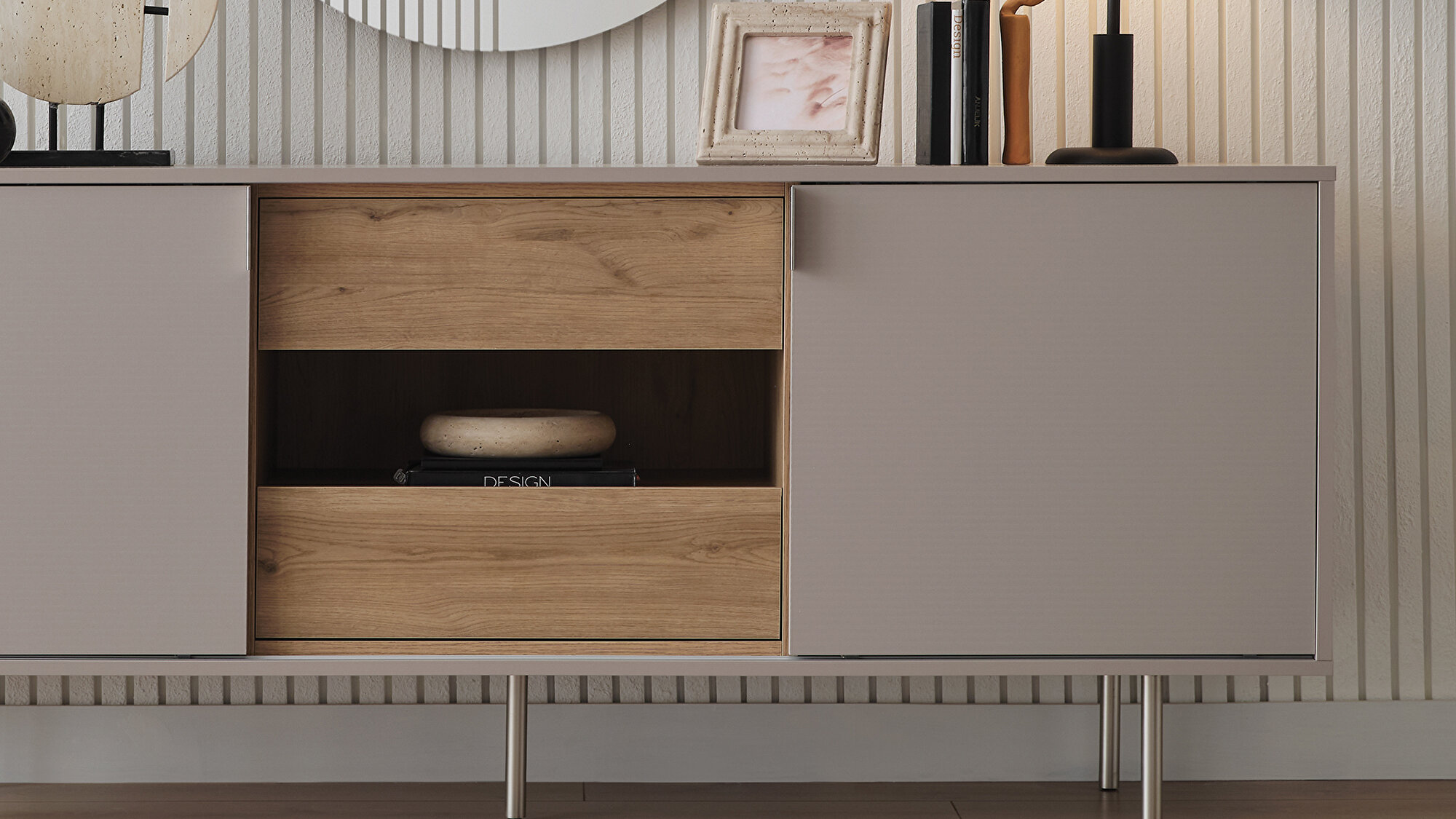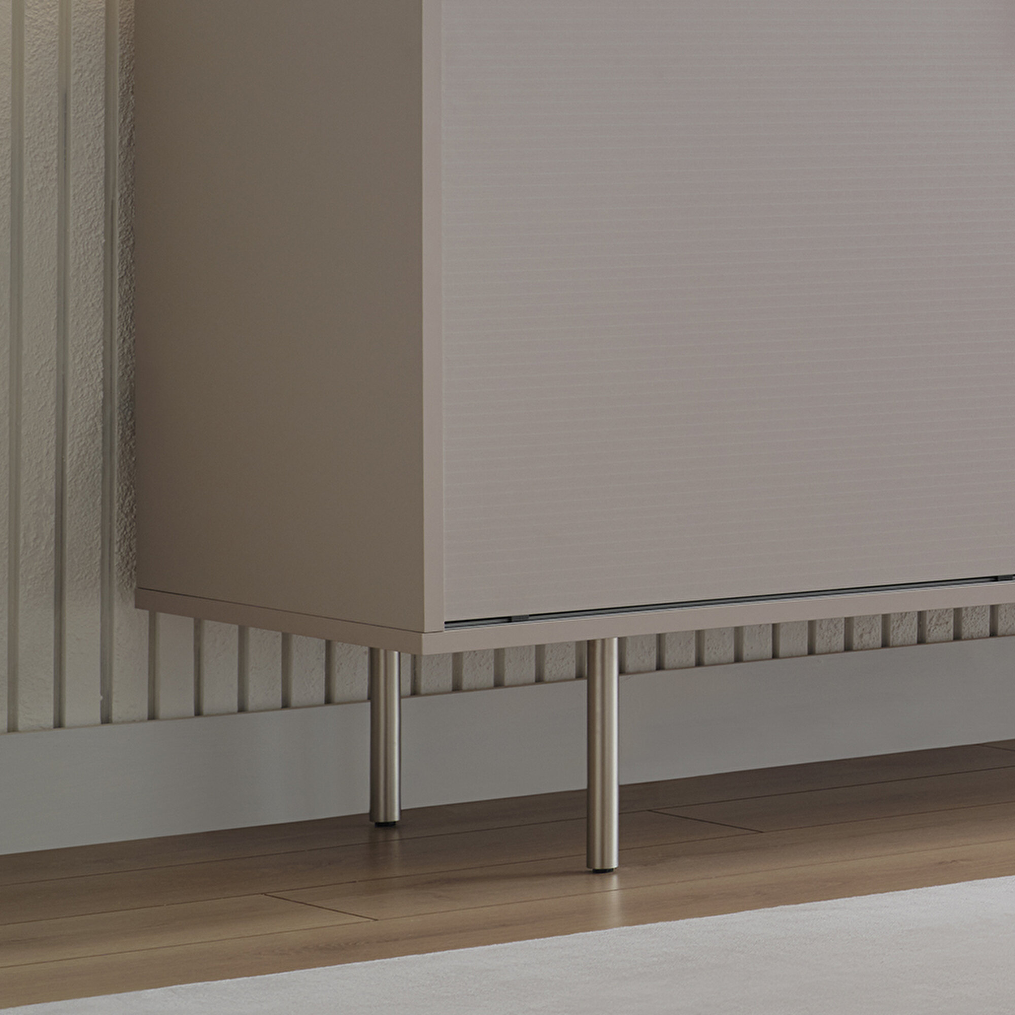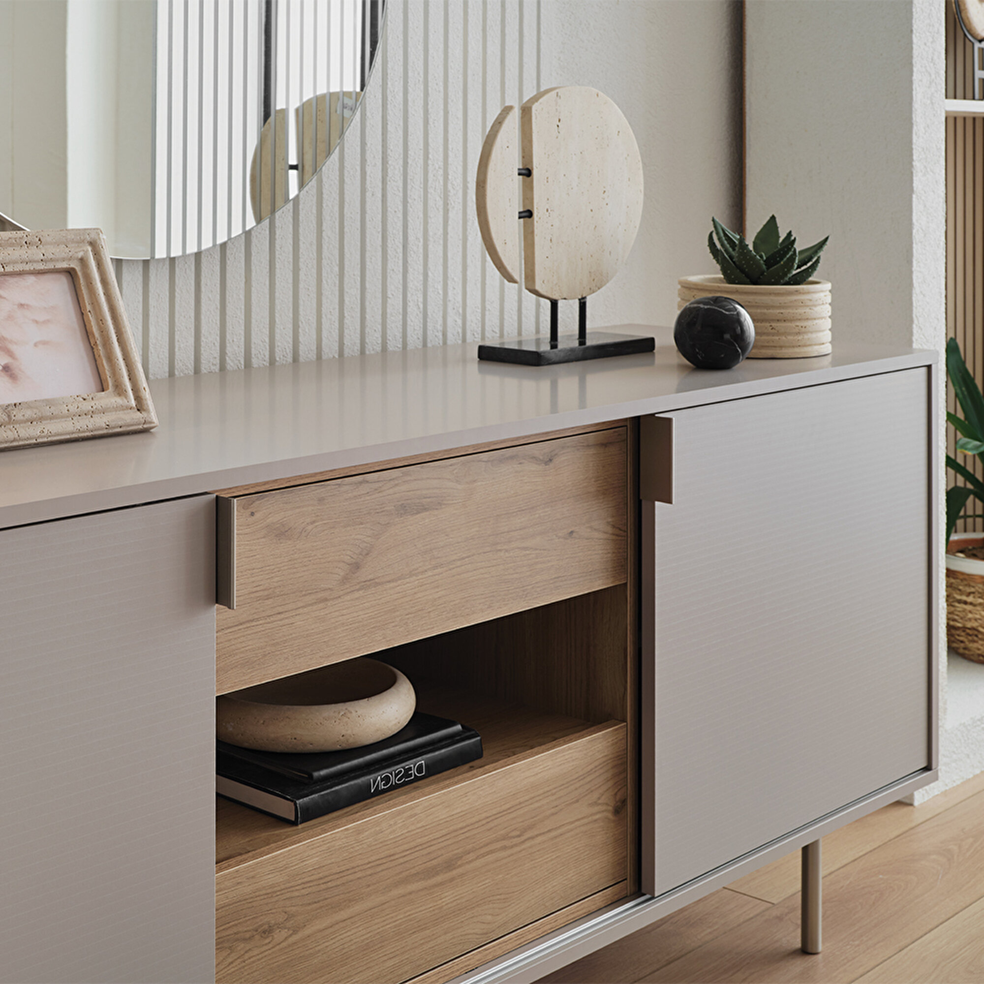 CANTE SIDEBOARD draws attention with its modern and minimalist design and reflects its elegance with its natural oak and beige color combination. While it increases the elegance with the special striped texture application on the doors, it provides ease of use with the sliding door application. The use of two drawers offers functional storage, while the inox metal handle and leg design completes its modern stance.