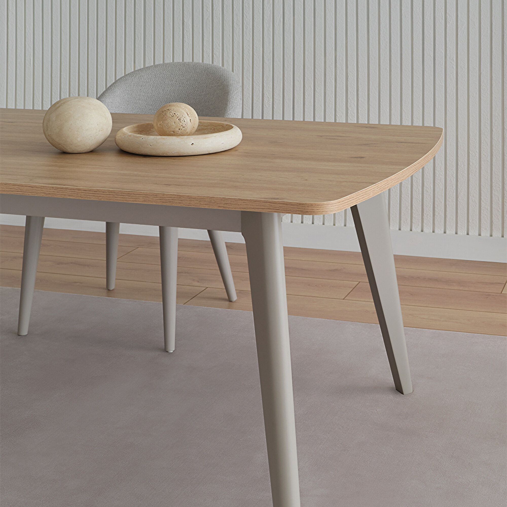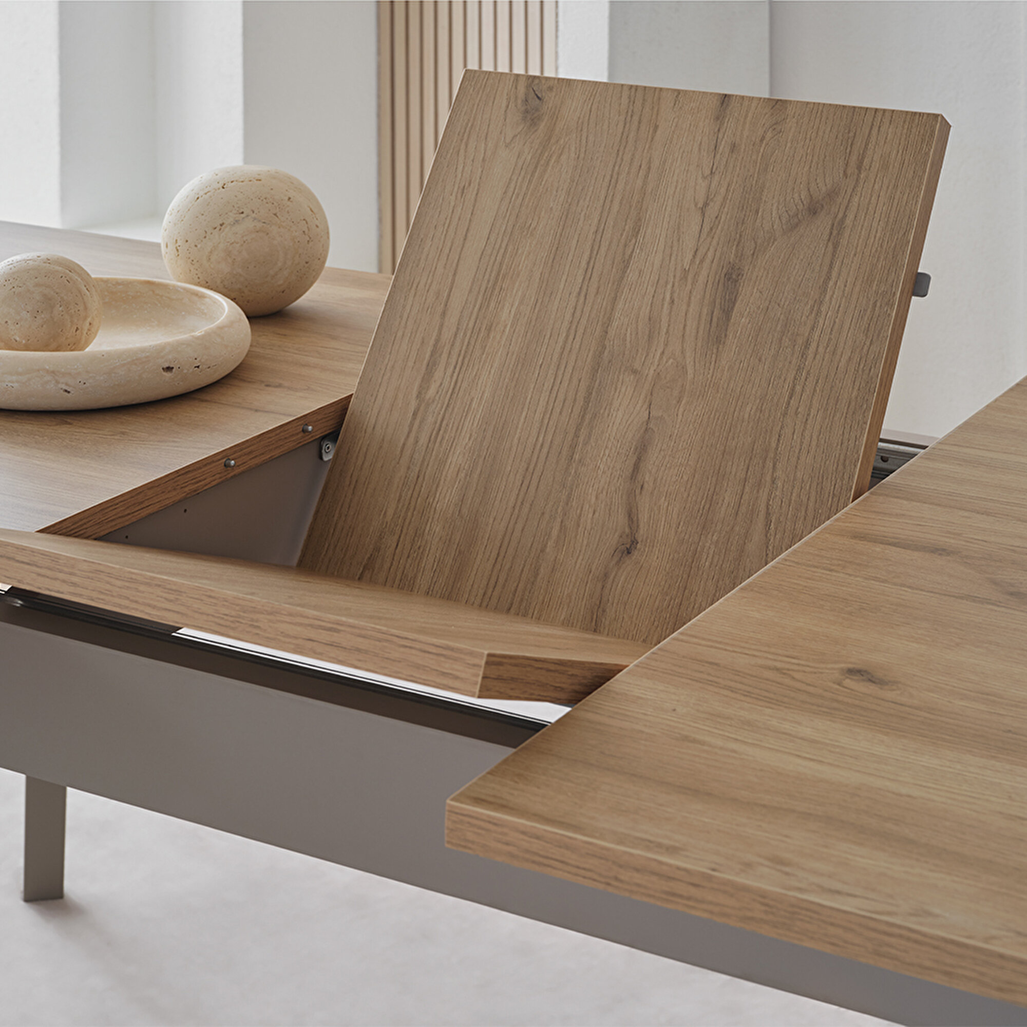 The CANTE EXTENDABLE TABLE adds an elegant touch to any space with its modern and minimalist design. Its natural oak-colored surface creates a warm and natural atmosphere while increasing the spaciousness and elegance of the space. Its rectangular form offers a wide range of uses, making it an ideal choice for all kinds of events, from family dinners to special gatherings. Its capacity of 6-8 people allows you to host your guests comfortably, while its opening mechanism offers a practical solution when extra space is needed. With both its aesthetic and functional features, the CANTE Extendable Table makes your living spaces more useful and stylish.