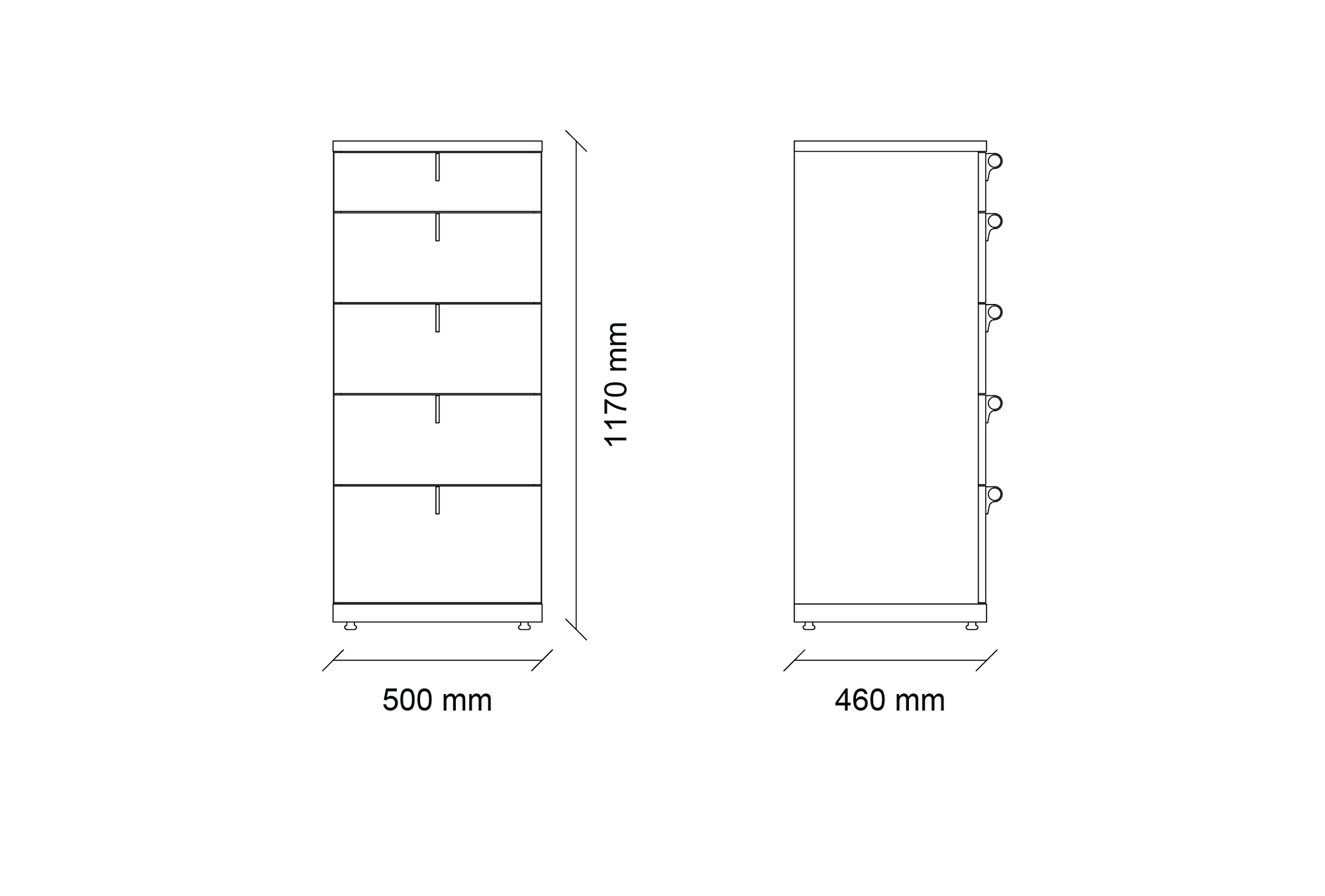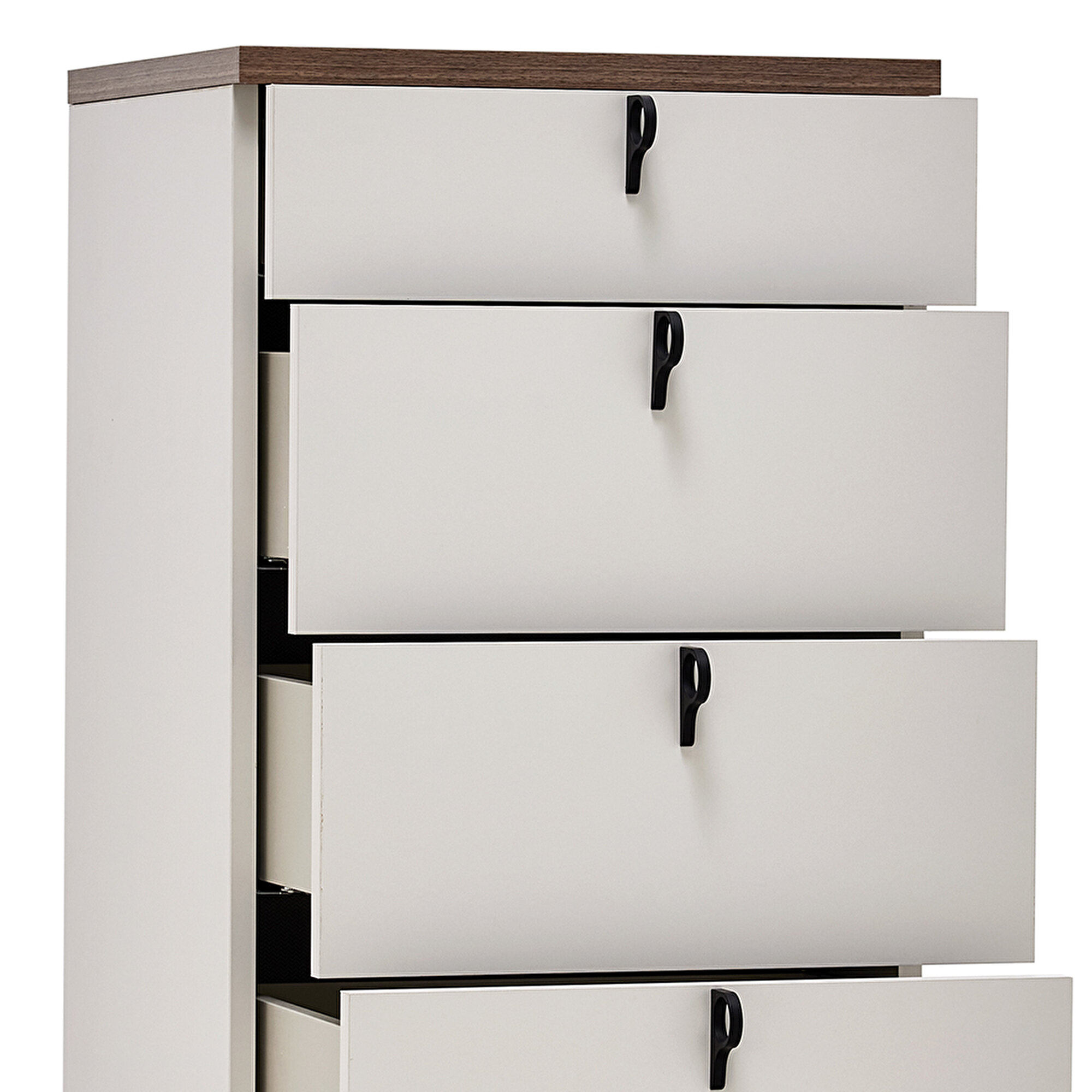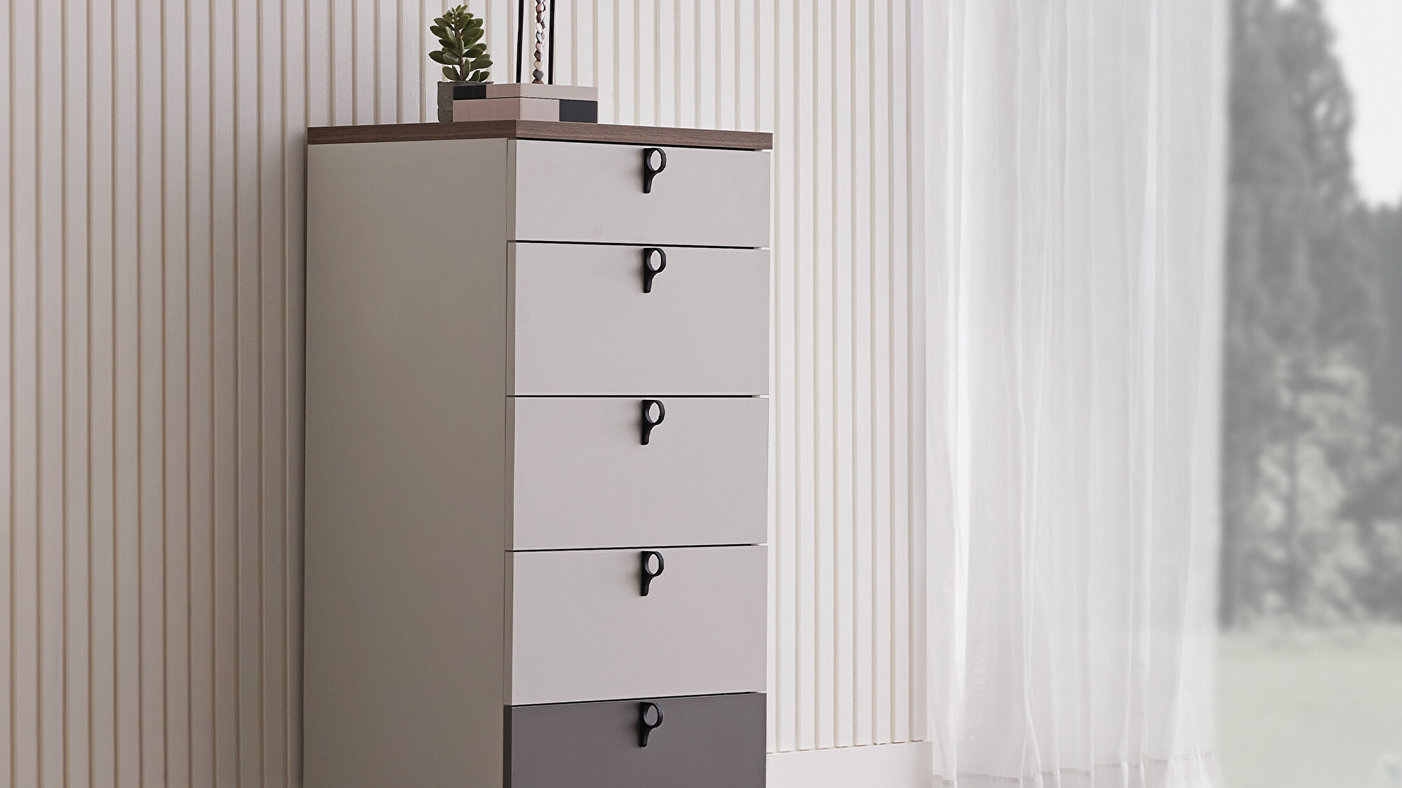Convenient Storage Spaces CORDELL HIGH CHEST OF DRAWERS stands out with its 5 drawers and offers solutions to storage space needs. Thanks to its decelerating hinge and rail system, it provides a quiet and safe use.