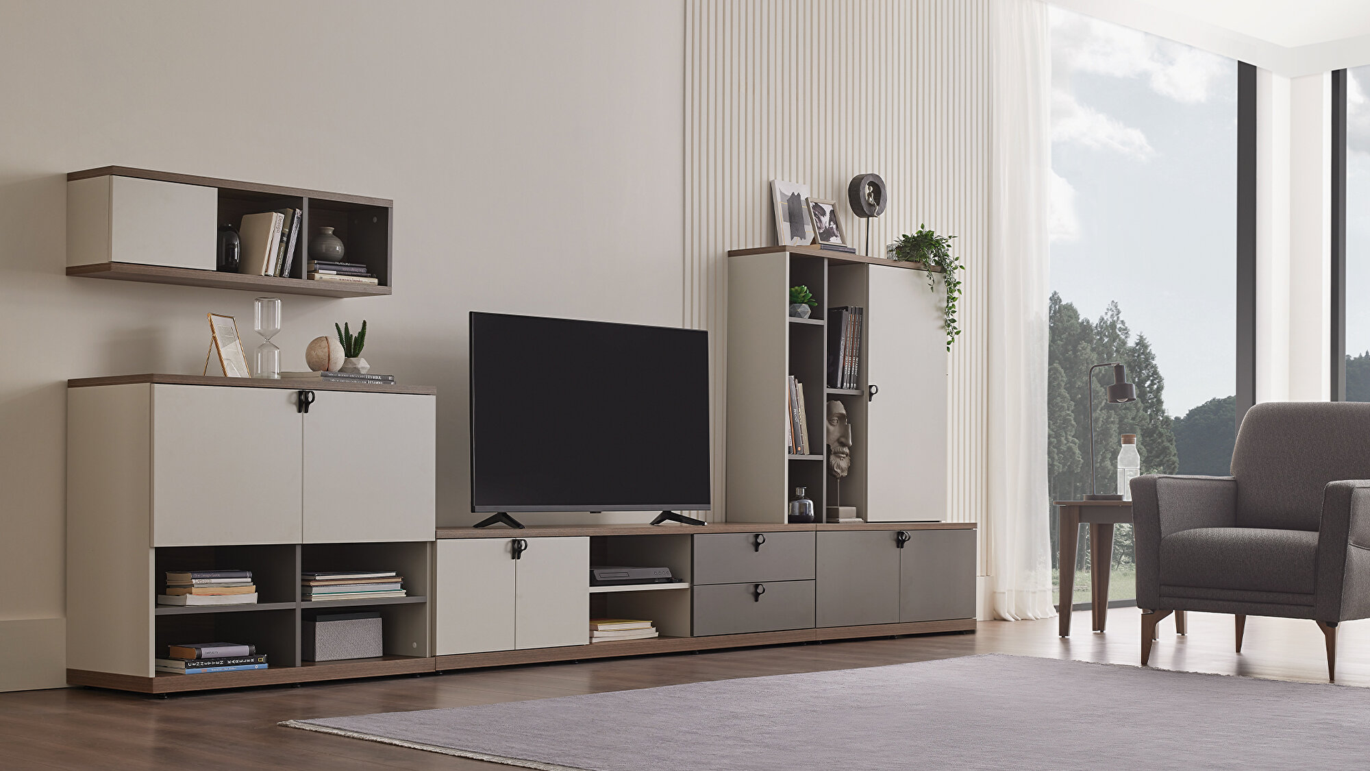 Standing out with its stylish design line and maximum functional advantages, CORDELL TV STAND combines the warmth of wood with a natural elegance with walnut, gray and off-white surface applications.