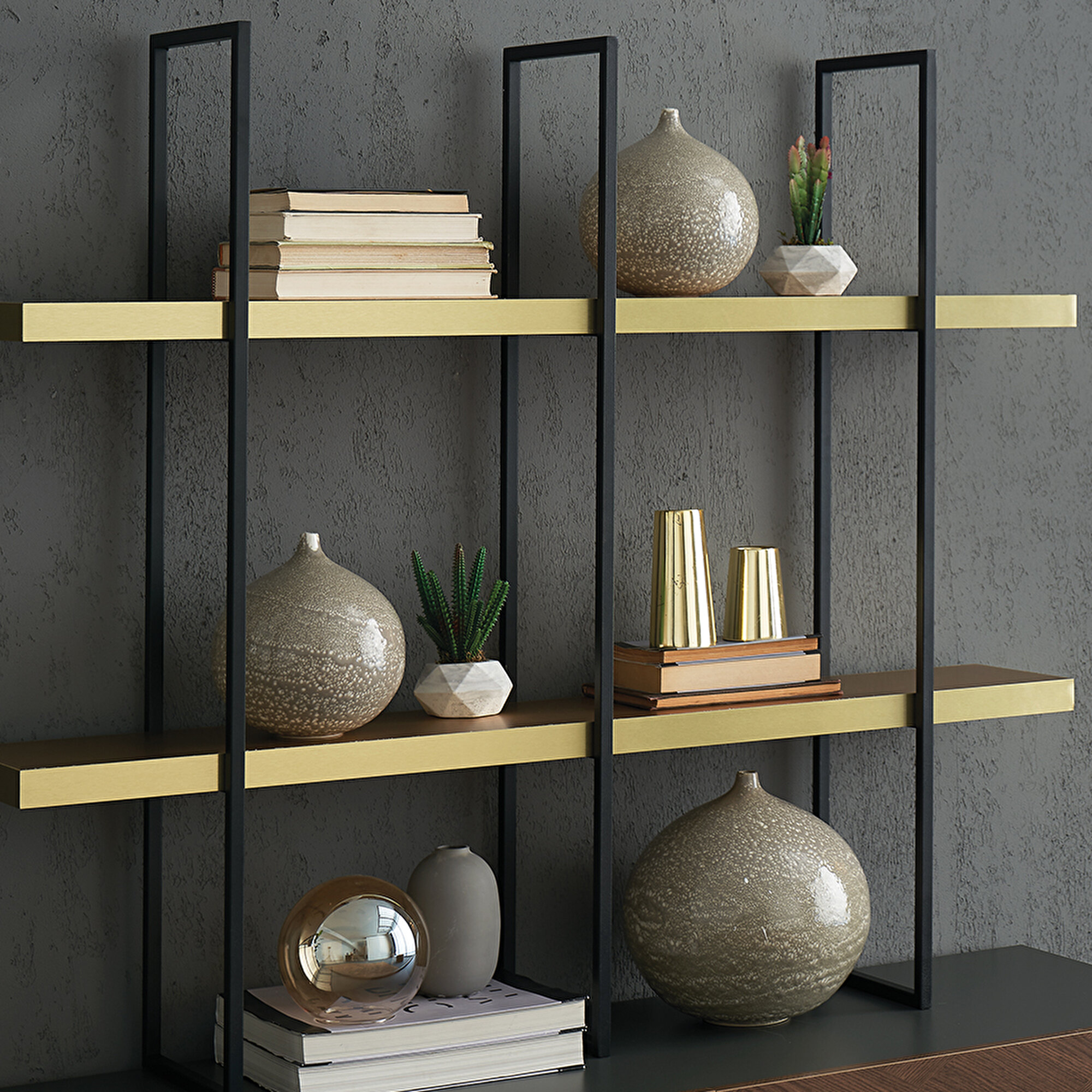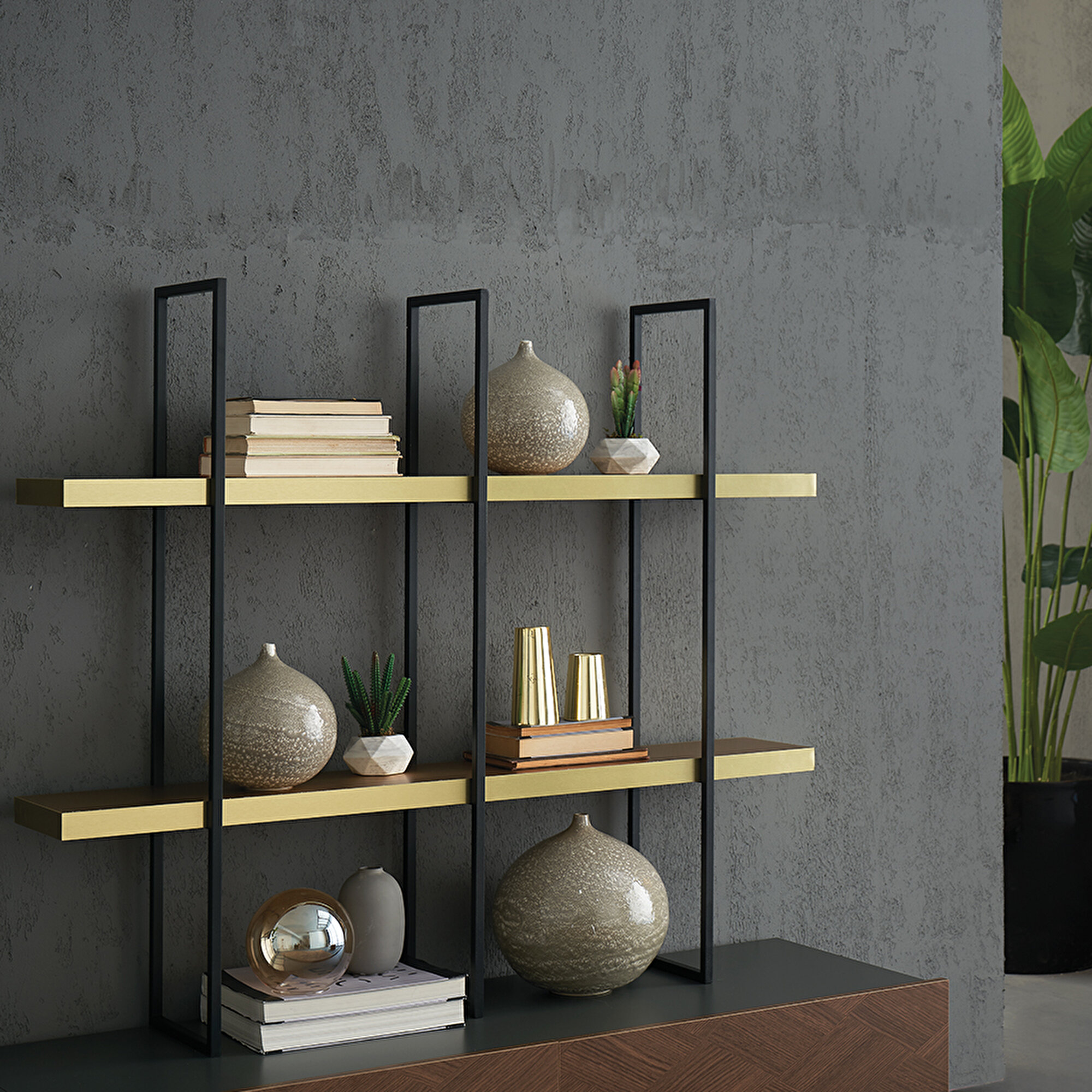 Stylish and Refined PostureDORIAN METAL SHELF MODULE redefines modern decoration with its refined style that draws attention with its design details. It combines design and aesthetics with high functionality with its gold MDF shelves and black metal body, which highlight the modern and stylish characteristics of the series.