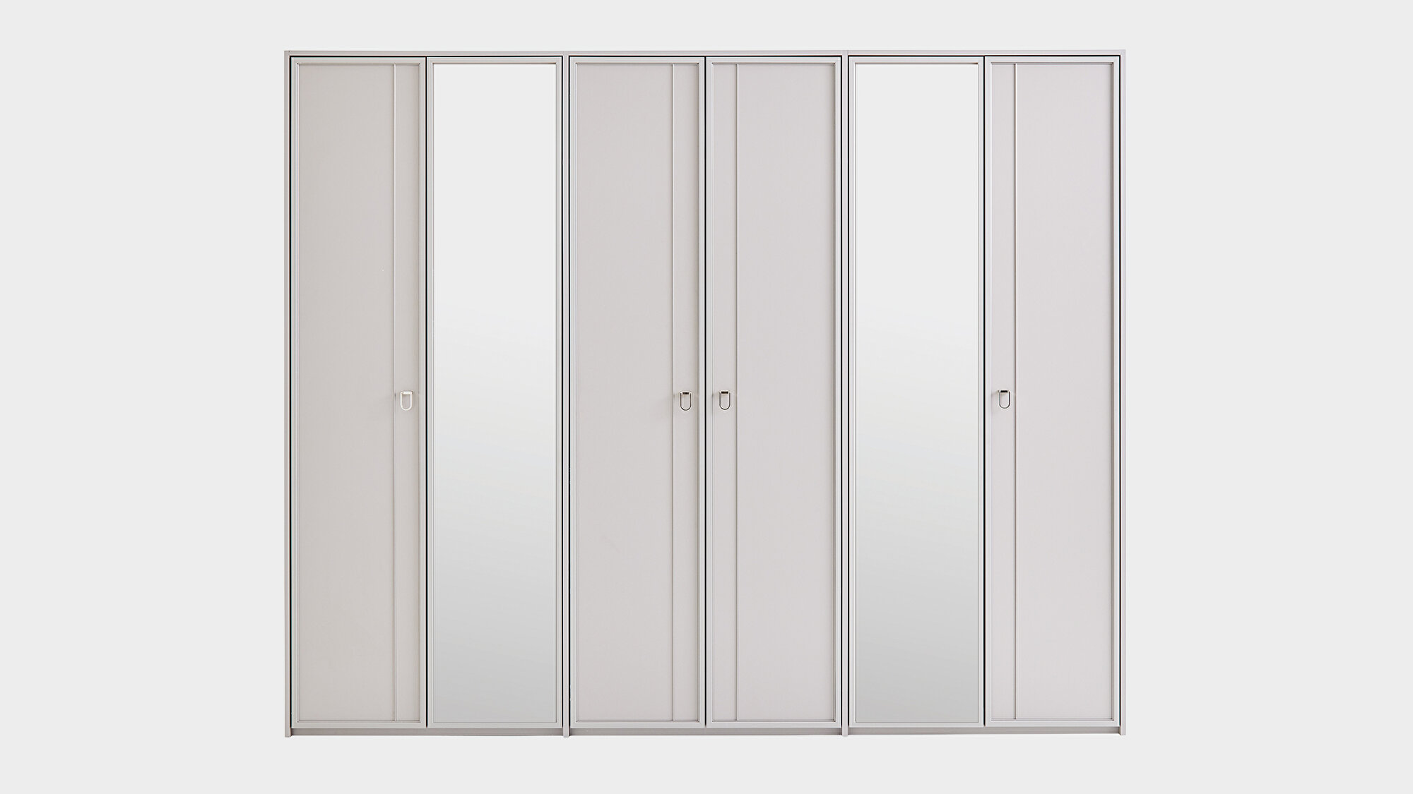 Stylish Details Bringing the contemporary and luxurious look elegance in stone color to bedrooms, HERA 6-DOOR WARDROBE creates rich visual details in bedrooms with its bronze metal cube design.