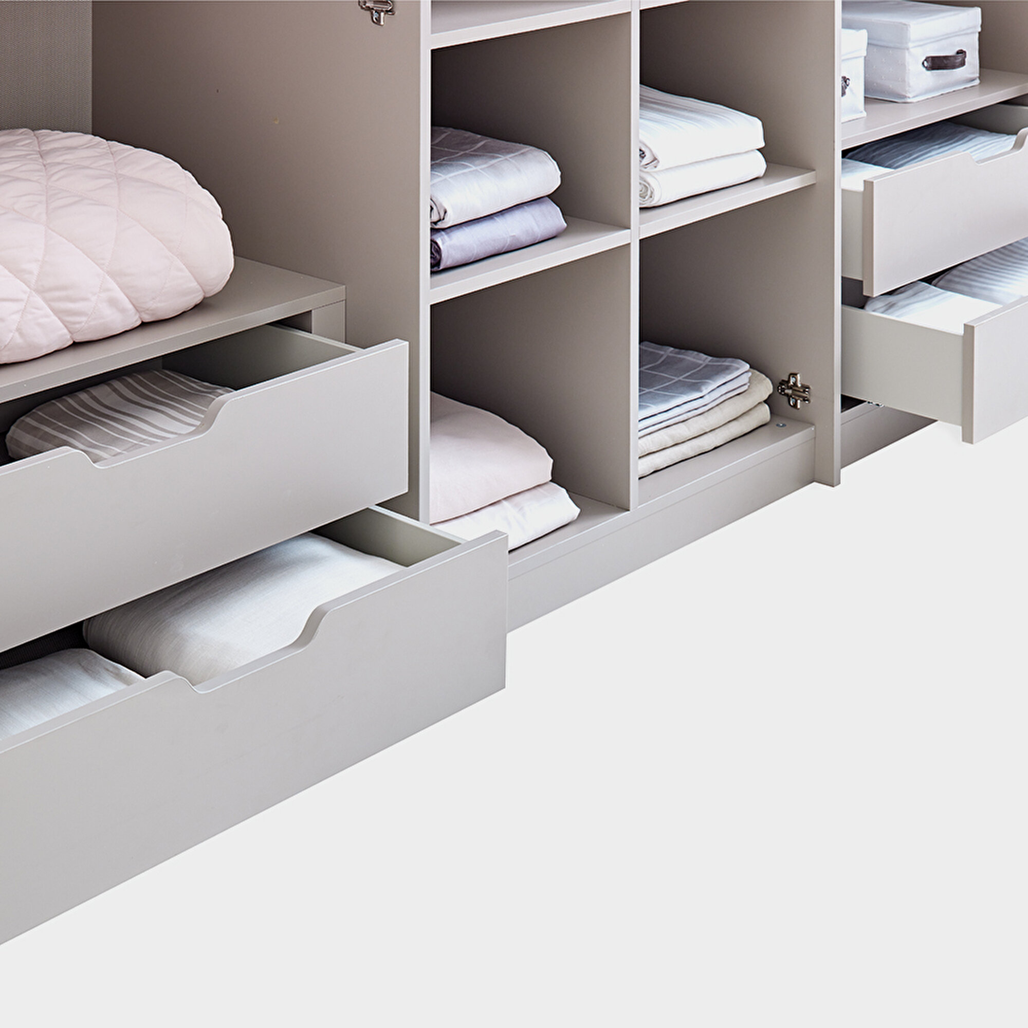 Stylish and Useful Drawers HERA 6-DOOR WARDROBE combines both elegance and functionality with its 4 drawers. Its large drawer spaces allow you to store your belongings in an orderly manner and allow you to easily access the items you need at any time. This detail is not only practical, but also offers a living space that does not compromise on elegance.