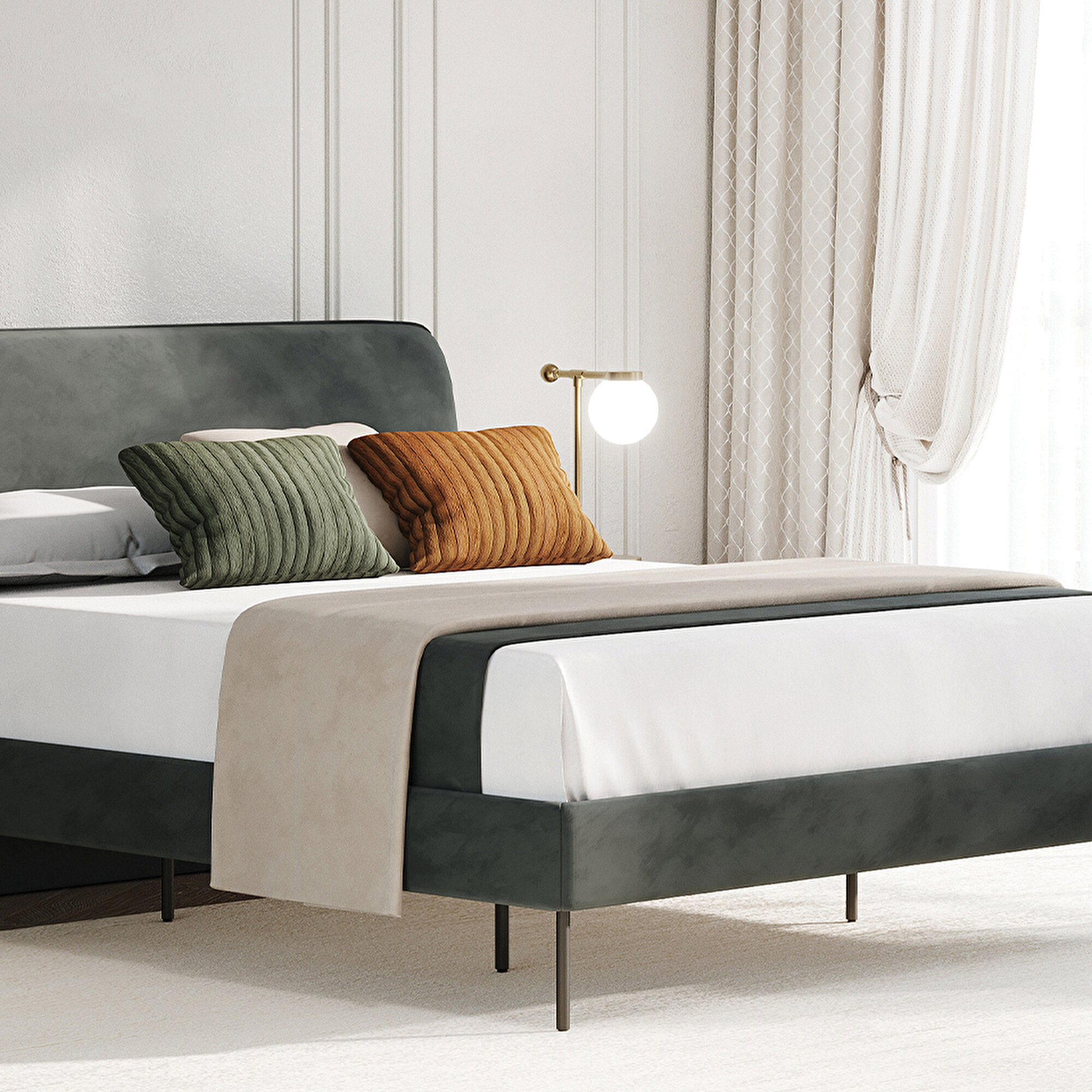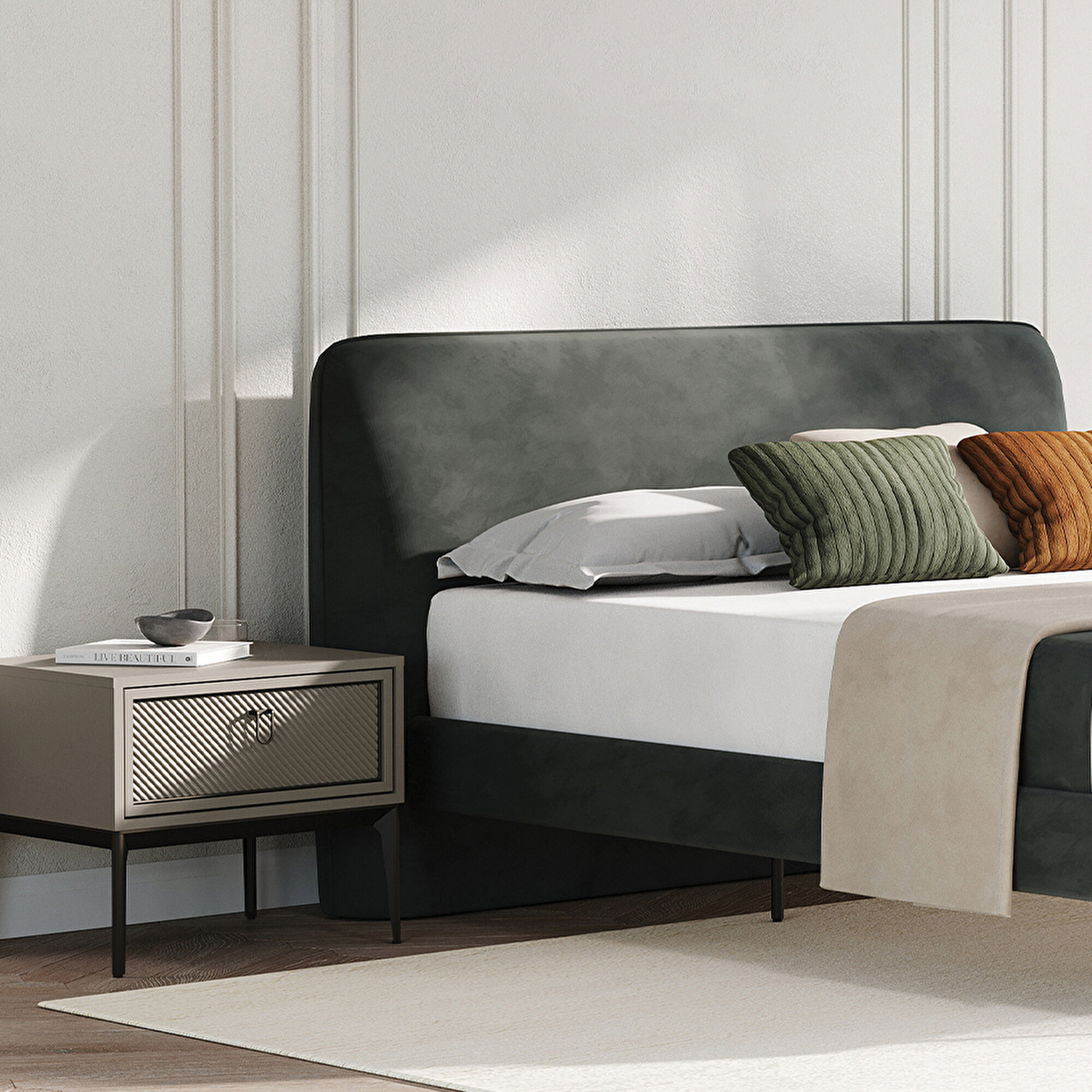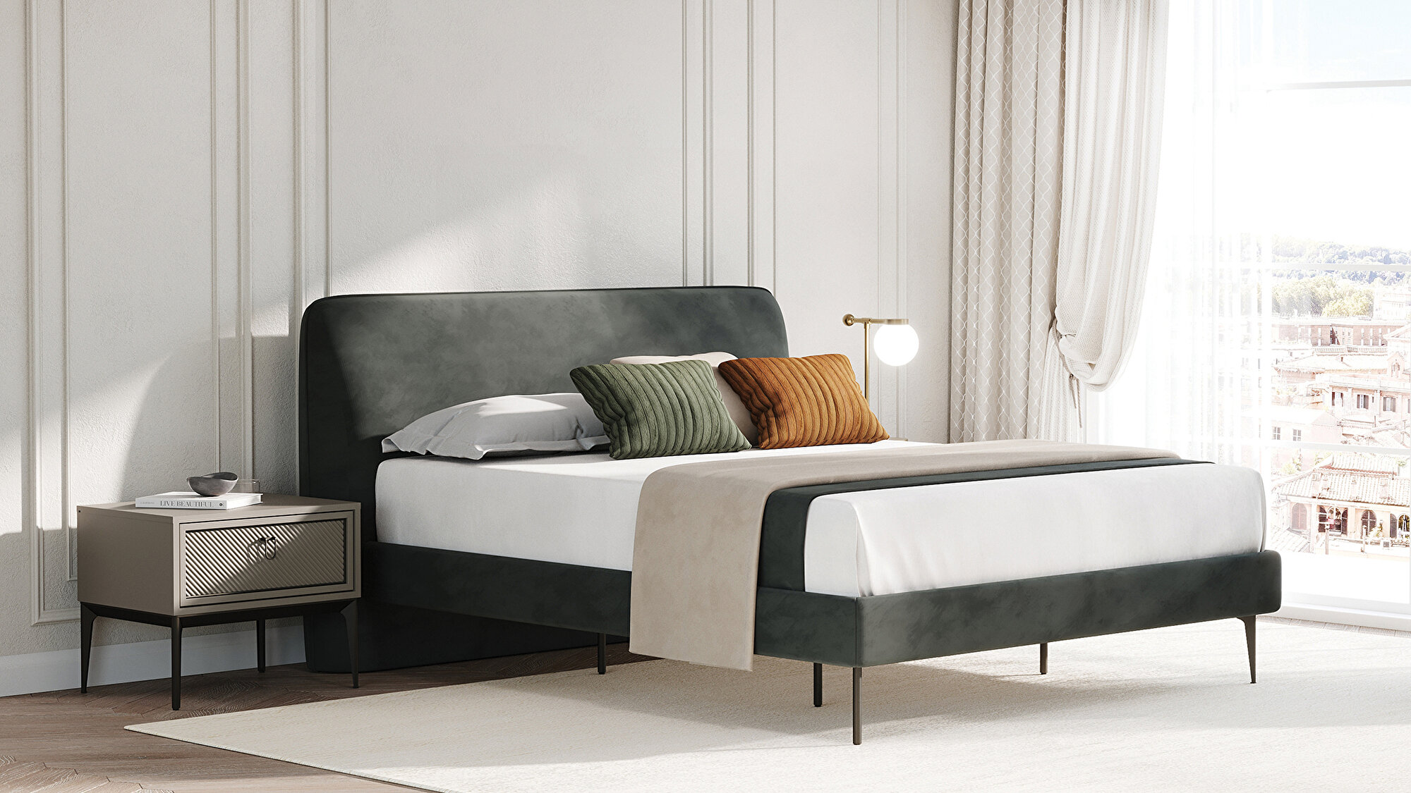 While the HERA BEDRAME with HEADBOARD offers a unique look with its piping applied headboard, it strengthens the modern design approach with its metal legs. Combining elegance and durability, HERA BEDRAME with HEADBOARD fits perfectly into modern decoration style with every detail.