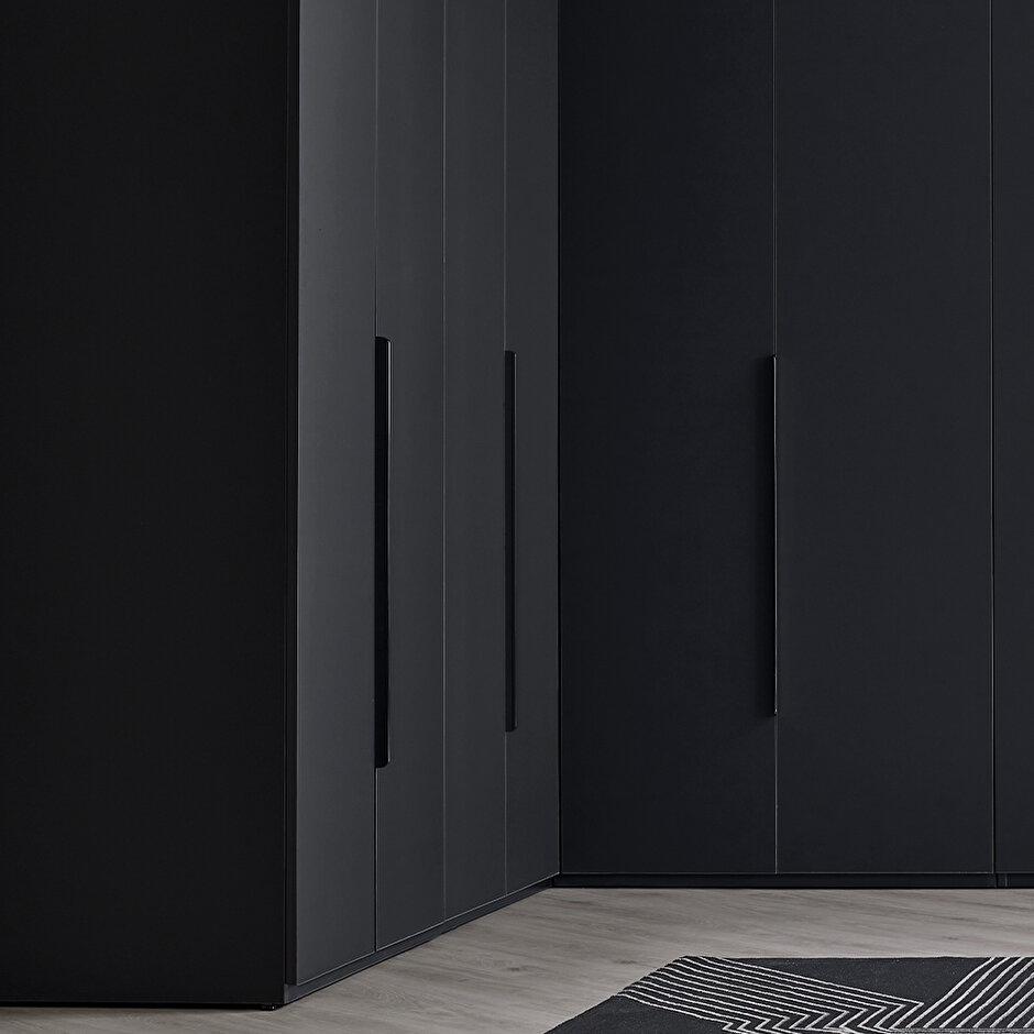 Eye-Catching Color Details Matte black surfaces are accompanied by smoke gray-colored, long and shiny metal handles. The metal handles of the LEGATO 4 DOOR WARDROBE model, which attract attention with its elegant appearance, also impress with its solid structure.