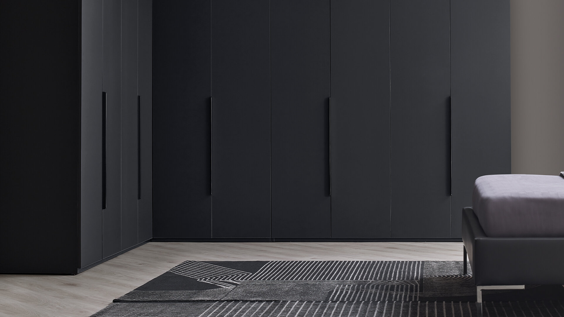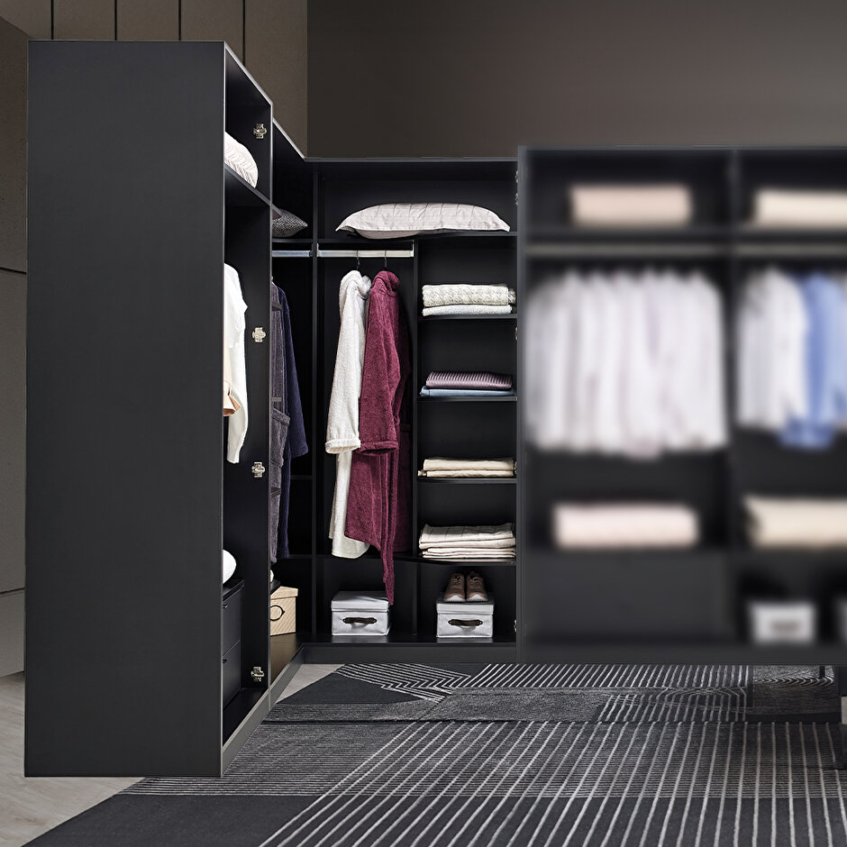 LEGATO 4 DOOR WARDROBE adds a dynamic atmosphere to bedrooms with its young and modern design. Emphasizing the monochrome style, which is frequently preferred in home decoration, LEGATO 4 DOOR WARDROBE emphasizes elegance with its long glossy smoke gray metal handles and matte black surface, while promising a functional use with its large storage areas. LEGATO WARDROBES, which have a modular structure, can be adapted according to the size of the space with the possibility of creating different combinations.