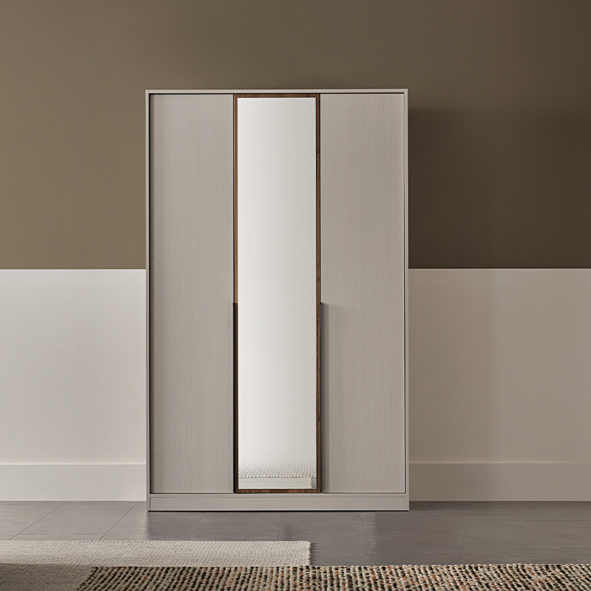 LORETO 3 DOOR WARDROBE, where the light walnut and off-white color combination meets a dynamic design approach, emphasizes the natural style preferred in decoration with its use of a deep-textured surface where naturalness is at the forefront with metal matte black handles. LORETO 3 DOOR WARDROBE, where the stylish stance of the natural mirror application meets the dynamic design approach, also provides a safe usage experience with its decelerating hinge and rail system.