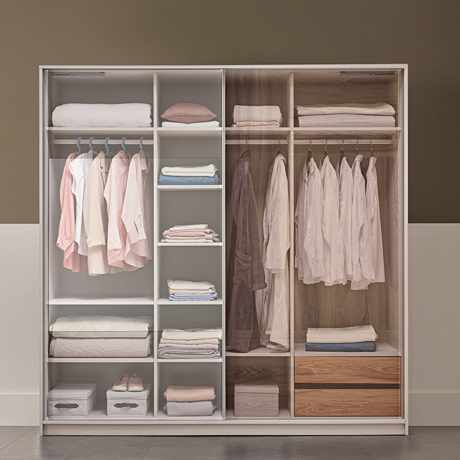 Functional Design LORETO SLIDING DOOR WARDROBE helps to organize living spaces with its large storage areas and shelf system designed with inspiration from the functional design line. LORETO SLIDING DOOR WARDROBE offers practical solutions to organize interiors with the storage areas it offers.