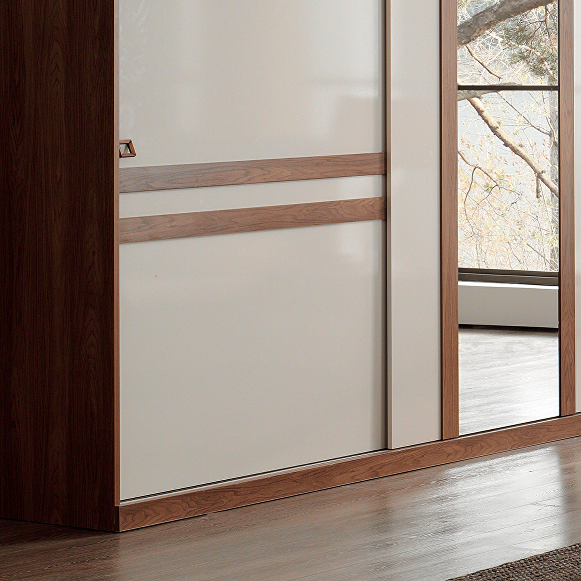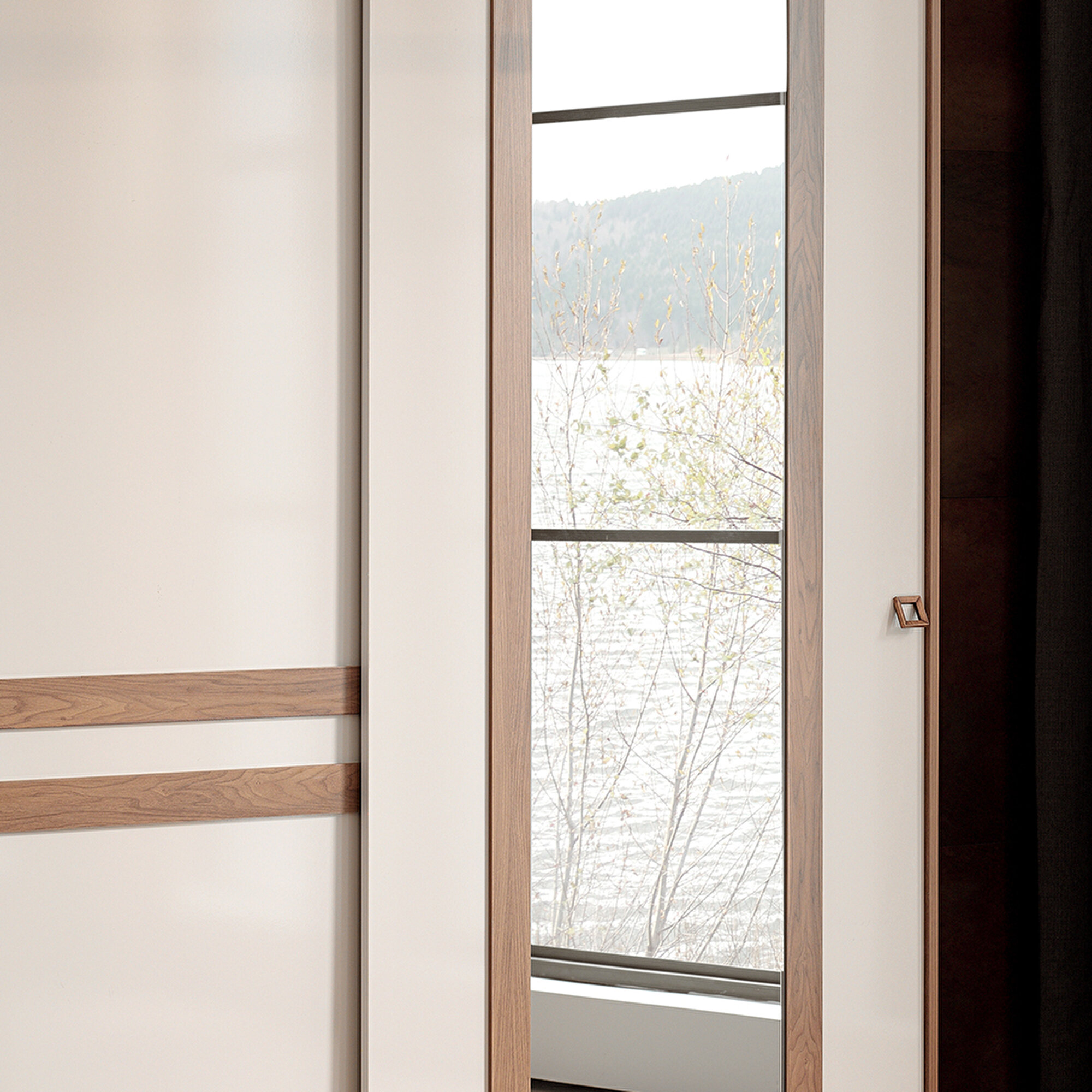 MISTRAL SLIDING DOOR Wardrobe creates a spacious and bright atmosphere in the space with its bright mink cream color combination that harmonizes perfectly with arizona walnut. Specially designed for the series, the square-shaped wood-like handles redefine the modern decoration concept with their impressive visuality.