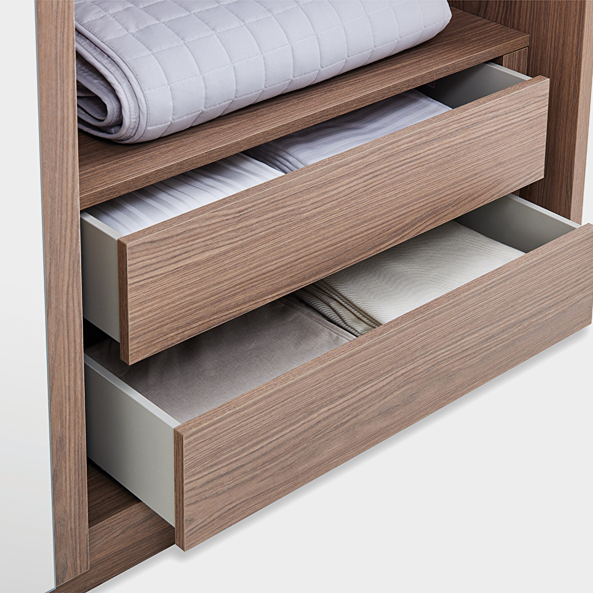 Creating a peaceful atmosphere with its warm and natural design, PALOMA 6-DOOR Wardrobe offers an elegant elegance with its deep-textured walnut color and natural color mirror details. While it provides an organized storage opportunity with its two drawer applications, it also meets all needs with its large interior volume.
