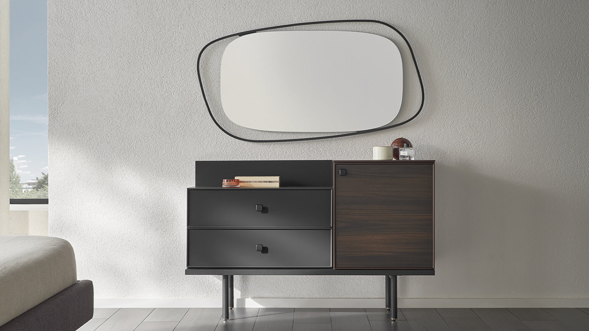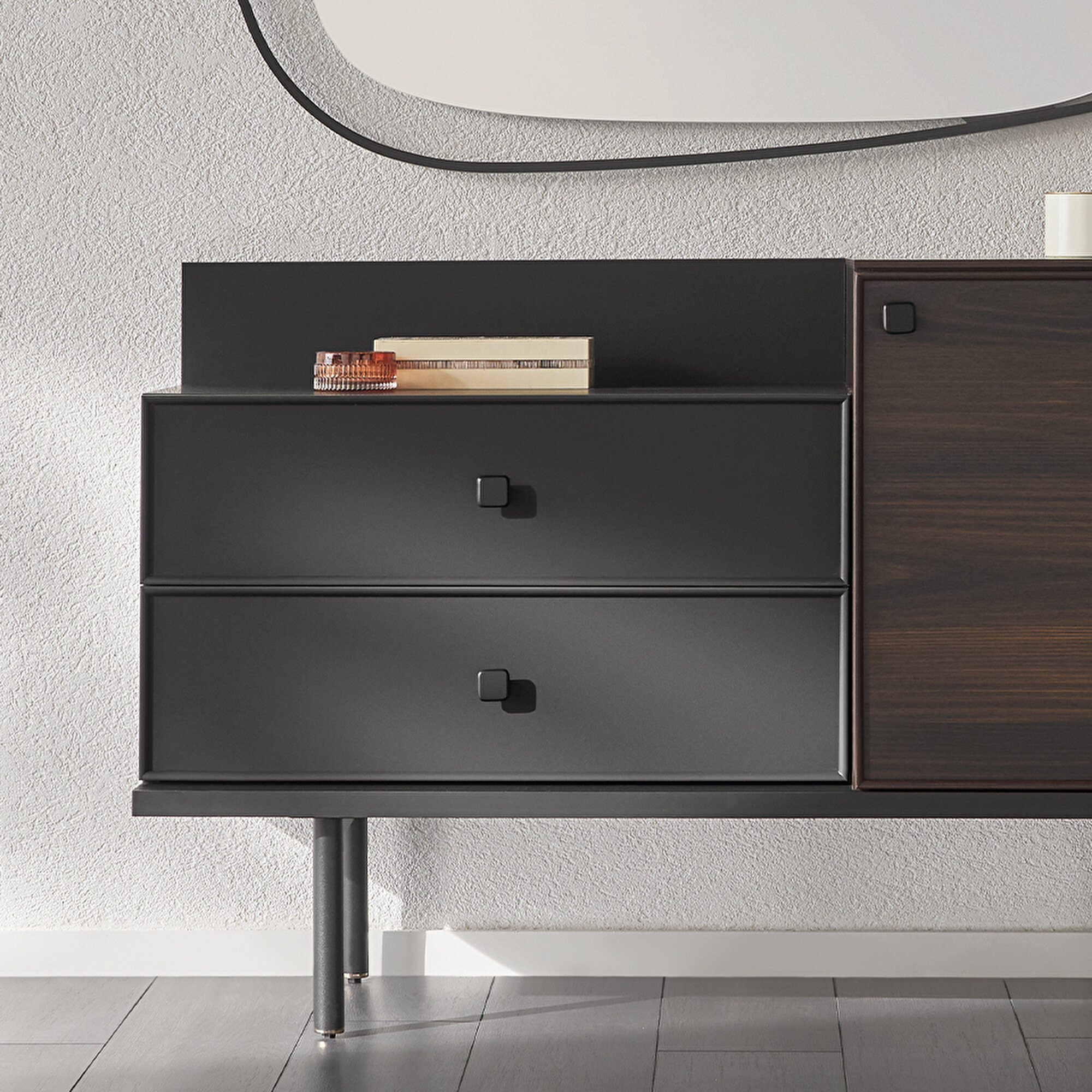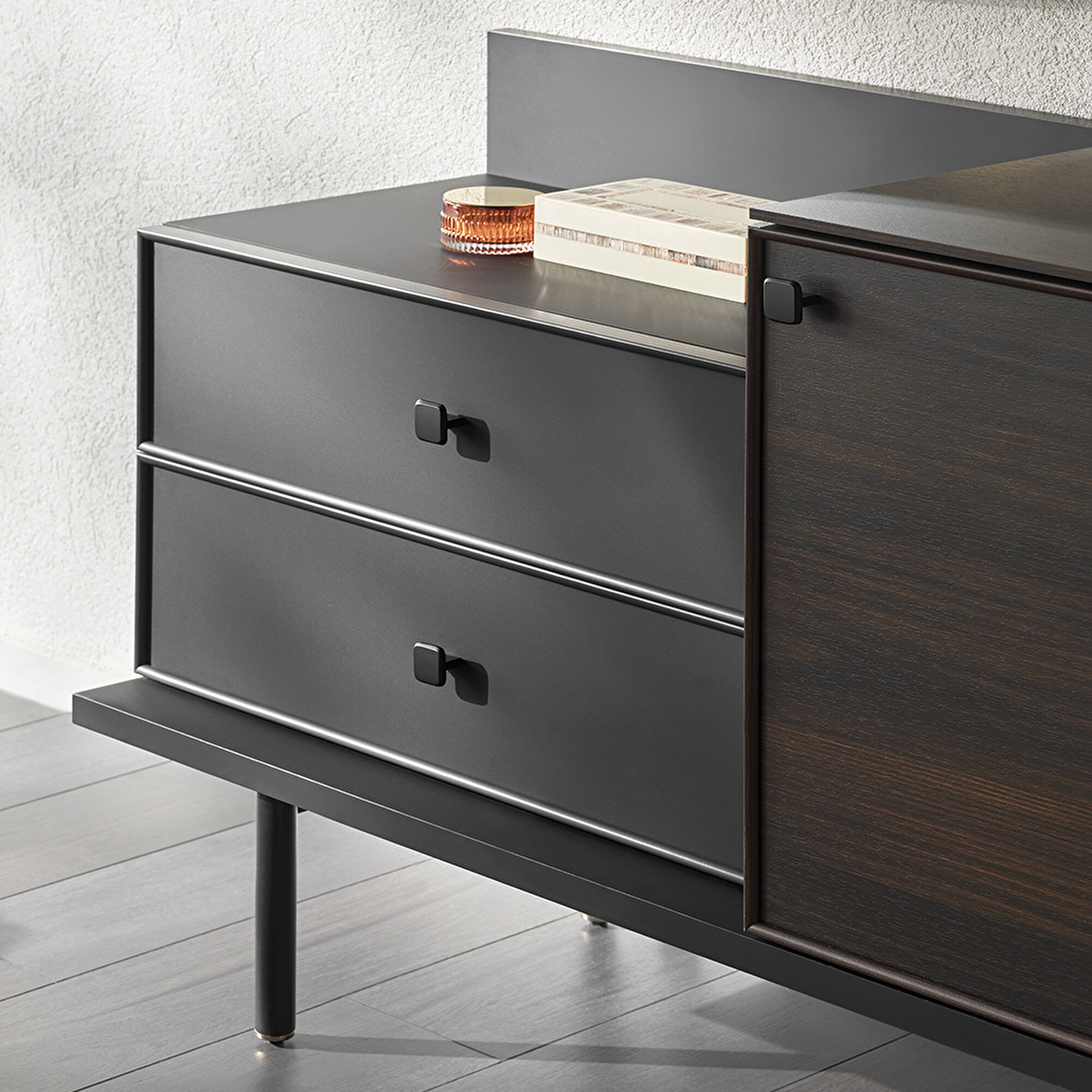 Unique Color Matching PARMA CHEST OF DRAWERS with both door and drawer application and subtle design details; Thanks to the combination of dark walnut and matte black, it takes on a contemporary aesthetic.