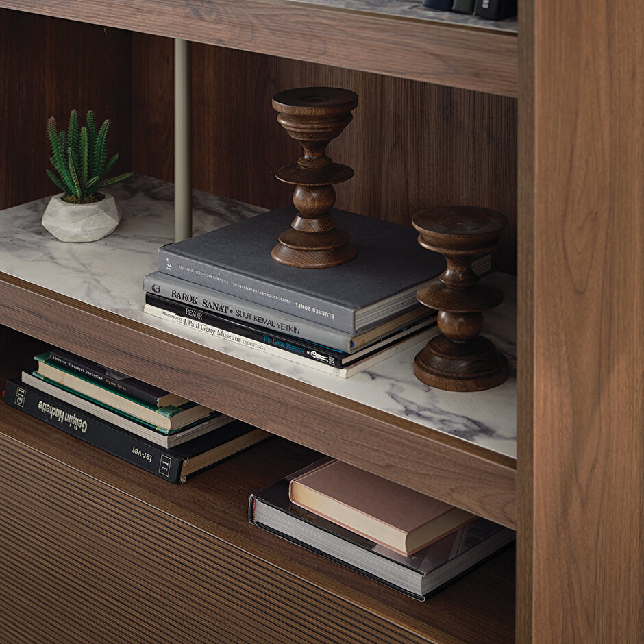 Modern wood look Geometric setups Deep wood textured warm walnut color use where naturalness is at the forefront Deep surface linear decor application Marble-like pattern application on the modules Large and small bookcase alternatives that allow combination
