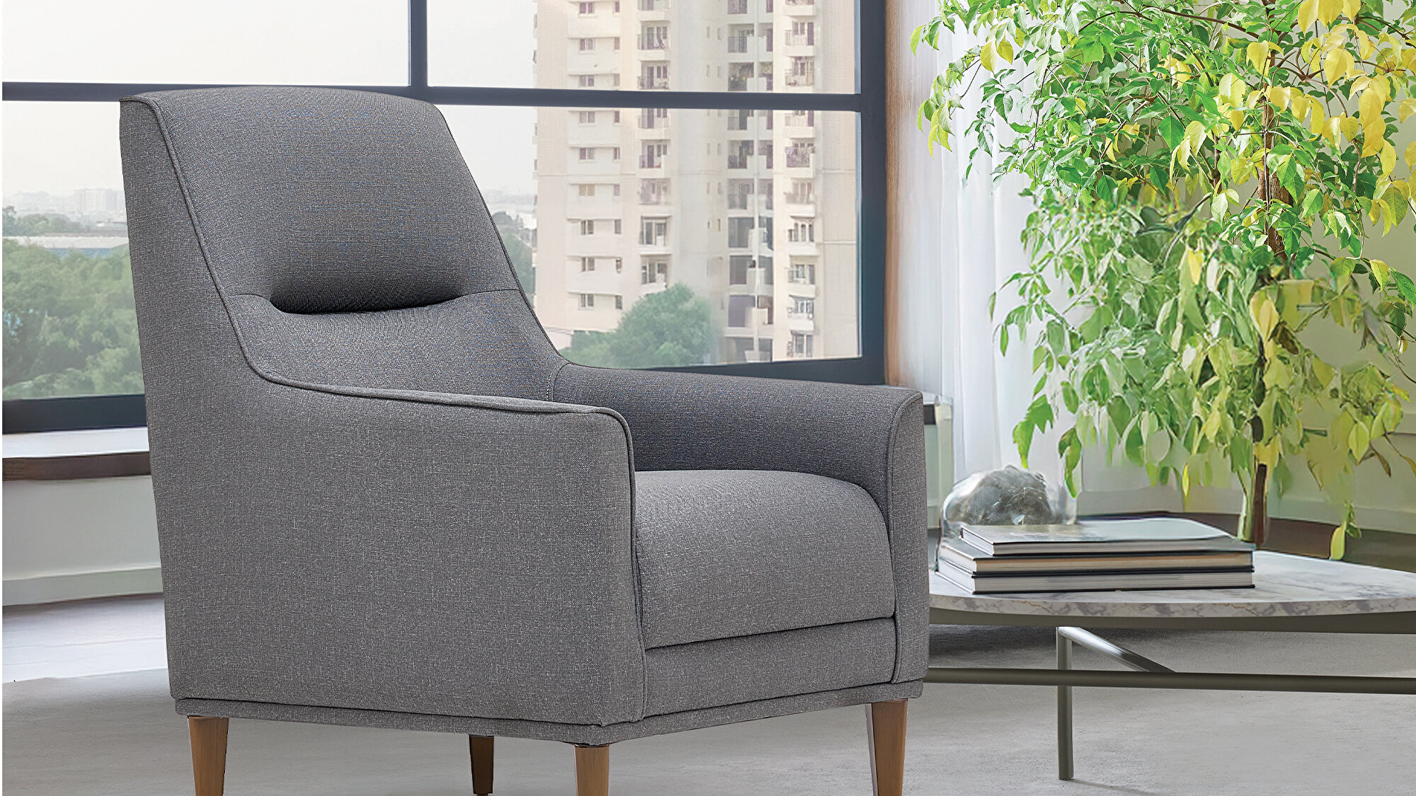 PAVIA ARMCHAIR, which is the continuation of the collection that perfectly combines comfort and modern design details, offers superior comfort. It adds a stylish touch to the design with 3 different wooden leg options, walnut, oak and anthracite, thick fabric upholstery and striking stitching structure. PAVIA ARMCHAIR, which has a construction that attracts attention with its elegance, adds a rich look to living spaces.