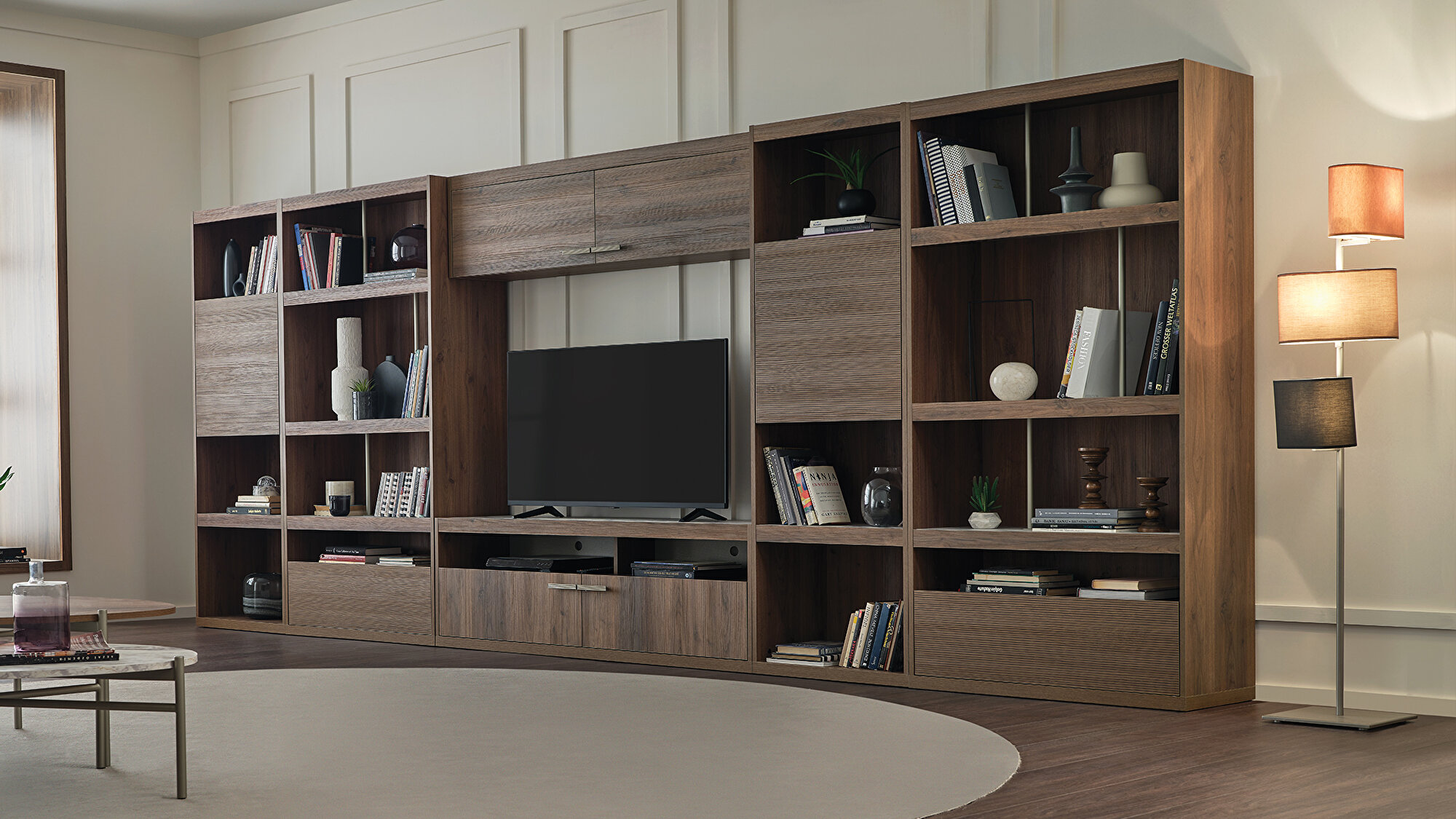 PAVIA TV UNIT, which reveals a natural aesthetic style with the use of wood-textured warm walnut color, combines its natural aesthetics with design details that make a difference. In addition to 2 different TV stand alternatives, base and free-standing, it offers versatile functionality with the modulation option that can be preferred by the user on the TV stand with base. It responds to different decoration needs with large and small bookcase alternatives that can be preferred according to the needs of use.