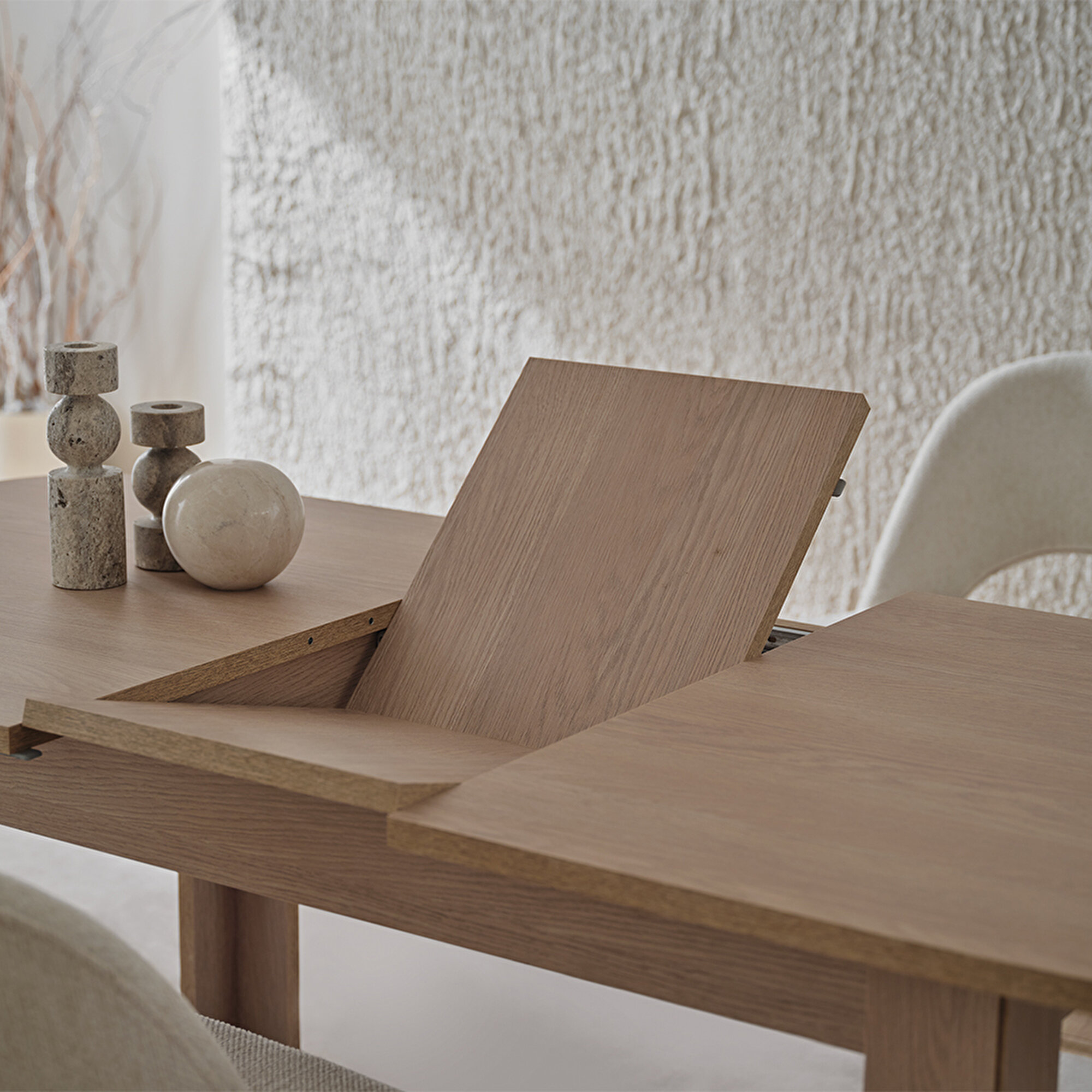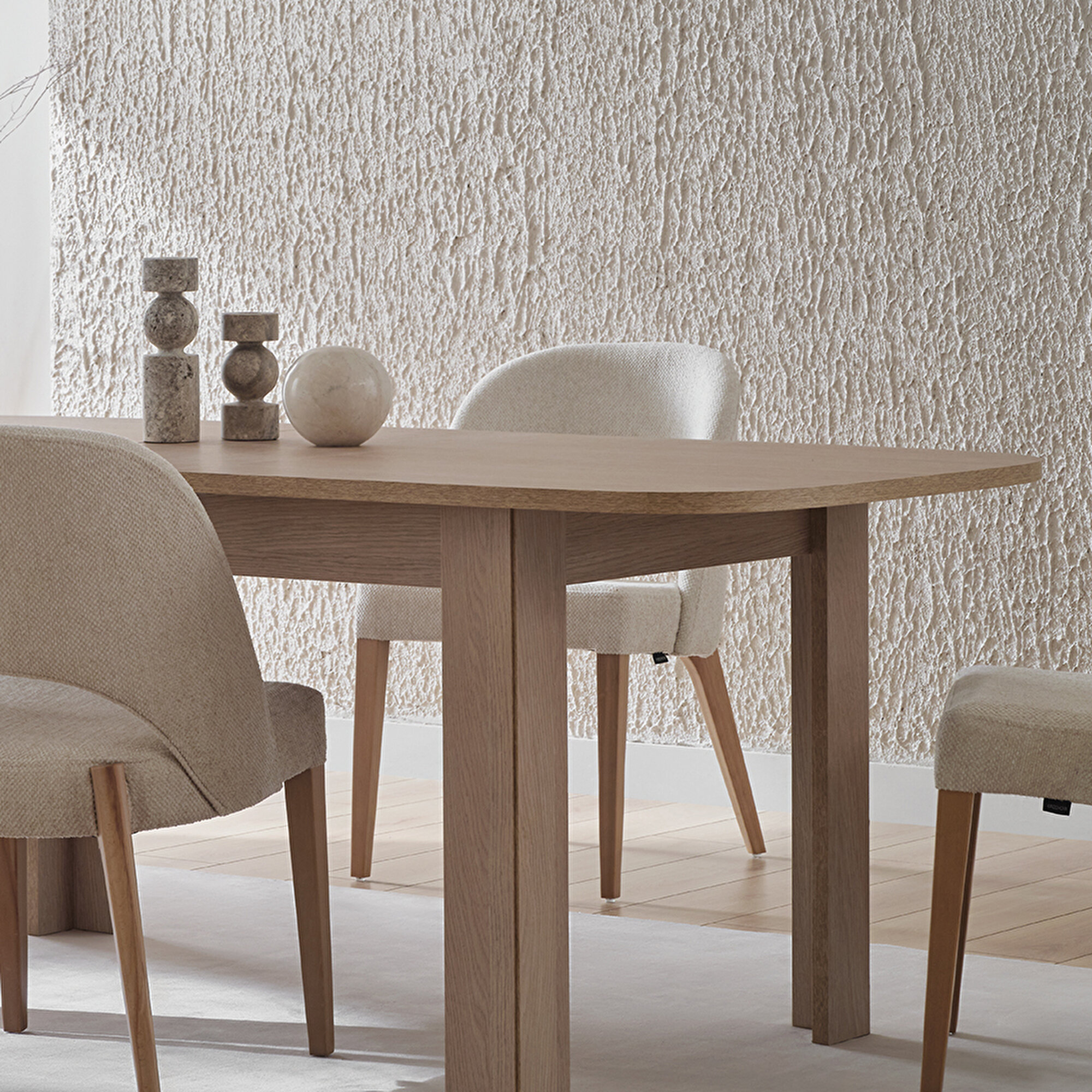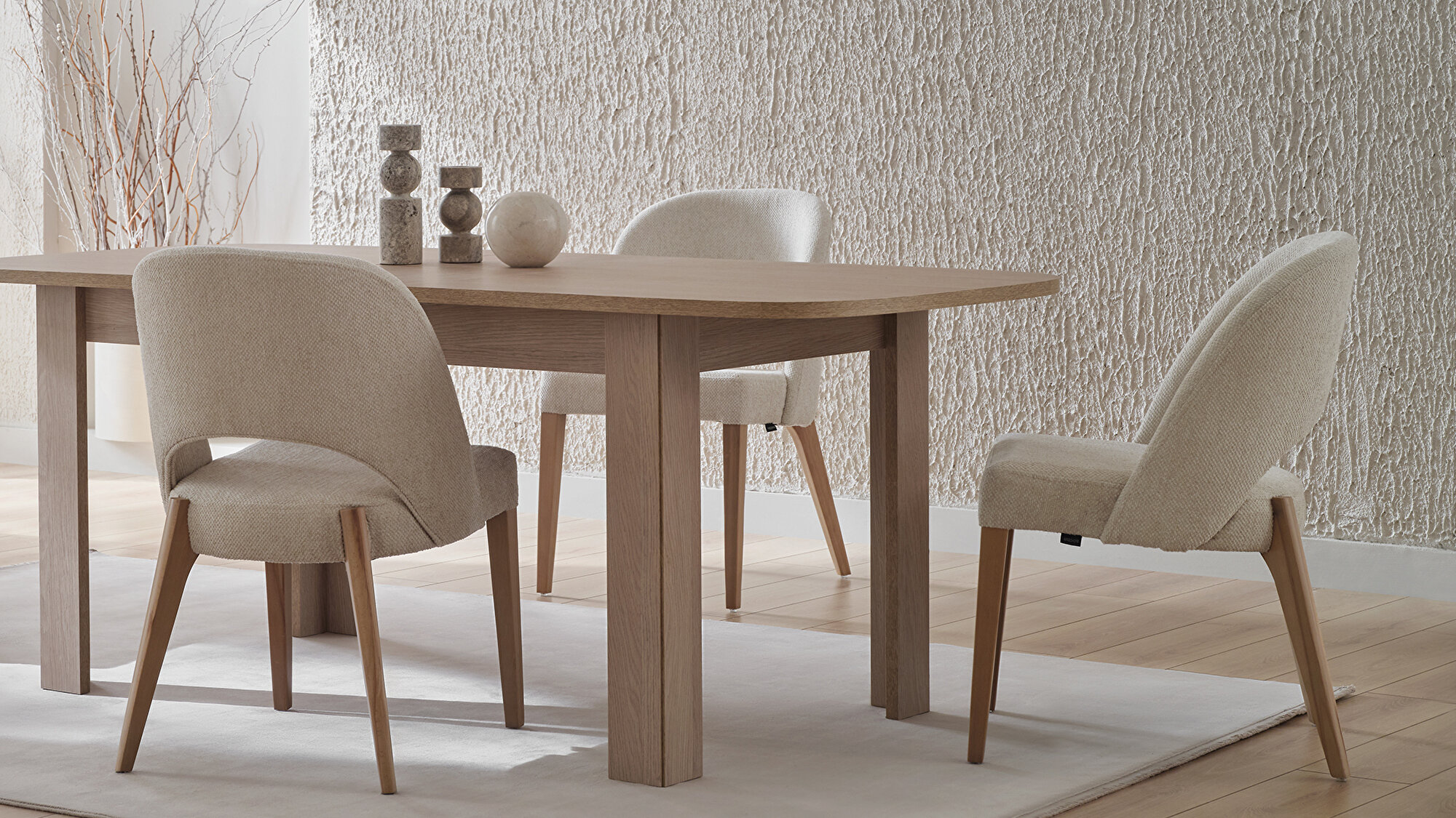 PERGE EXTENDABLE TABLE, the warmth of natural oak color combines harmoniously with the textile textured cream color to create a peaceful and friendly atmosphere. While it offers a solid structure with its details, it also creates a minimal and elegant design. PERGE EXTENDABLE TABLE is ideal for comfortable seating and functional use and offers a perfect option for large sessions with its openable structure.
