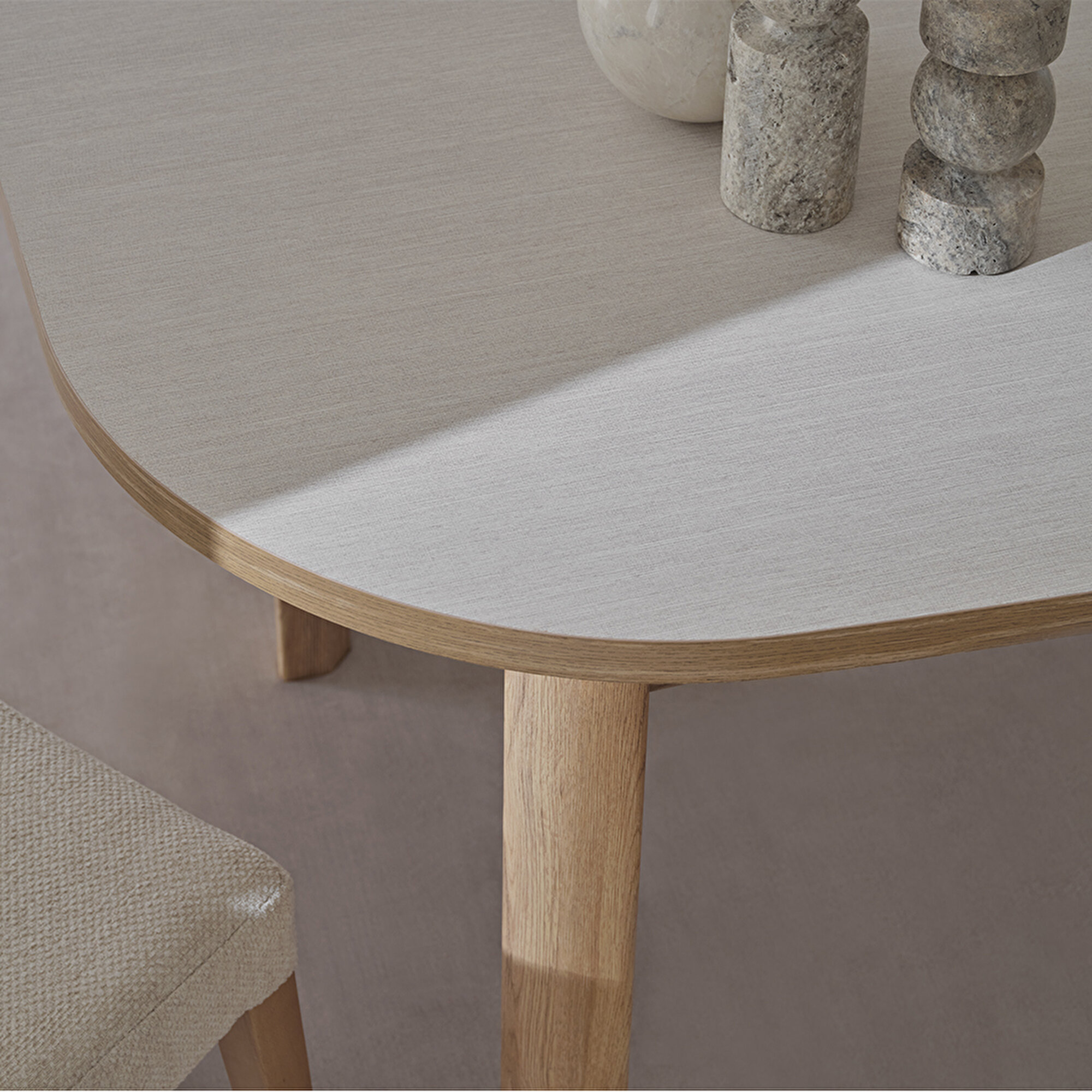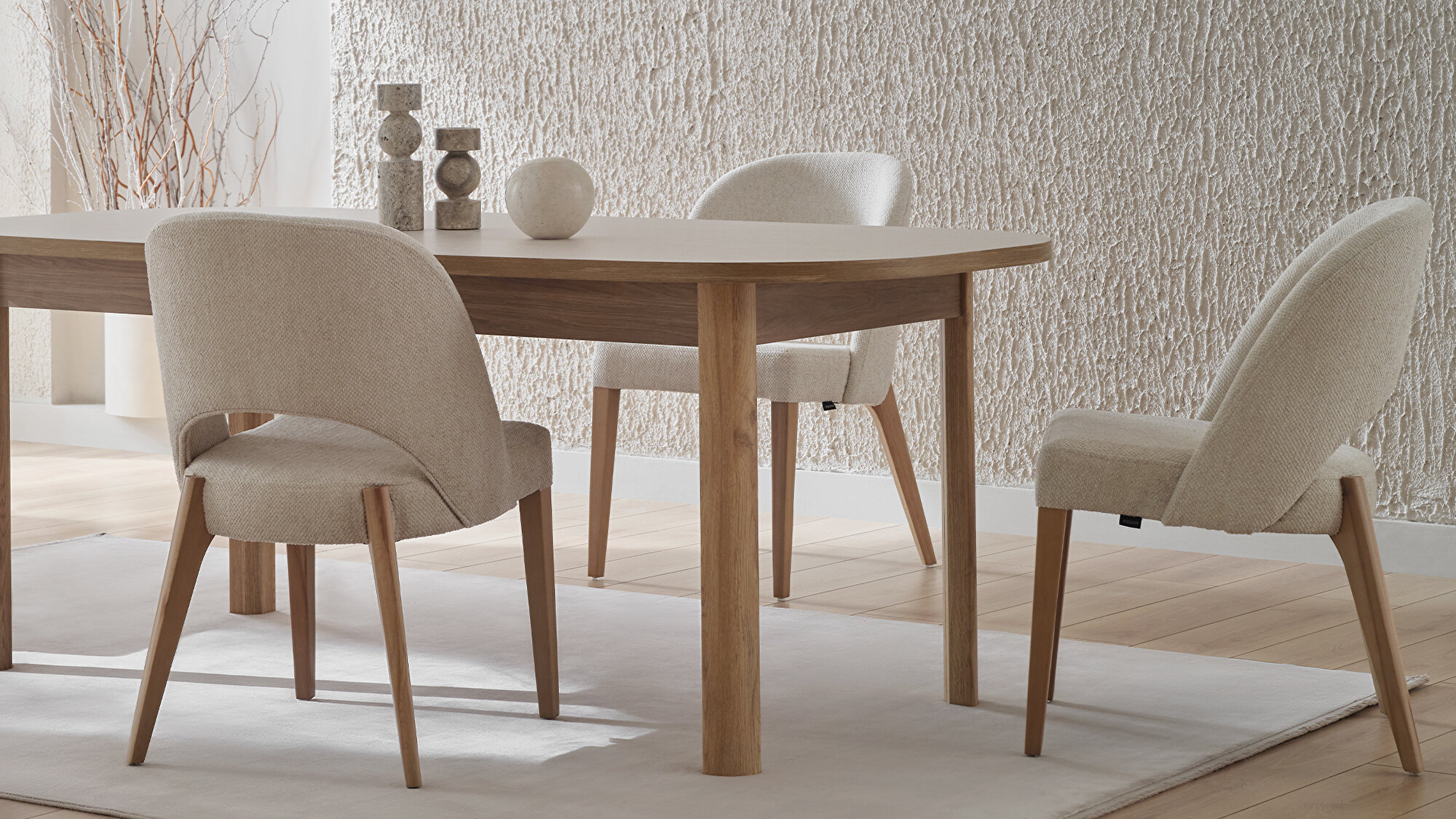 PERGE FIXED TABLE brings the free and sophisticated understanding of bohemian design to homes. It offers a sincere elegance by combining the warmth of natural oak color with textile textured cream color details. While the modern wood texture creates an eye-catching aesthetic from every angle, the MDF leg application strongly complements the durability of the table. PERGE FIXED TABLE creates a natural and comfortable atmosphere.