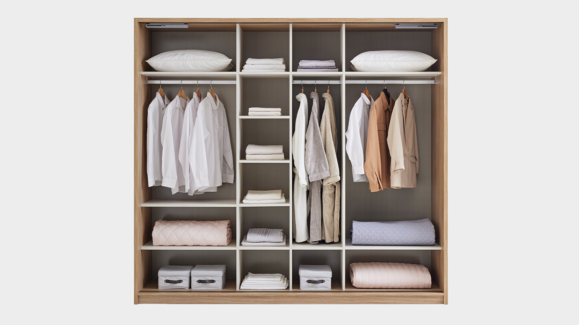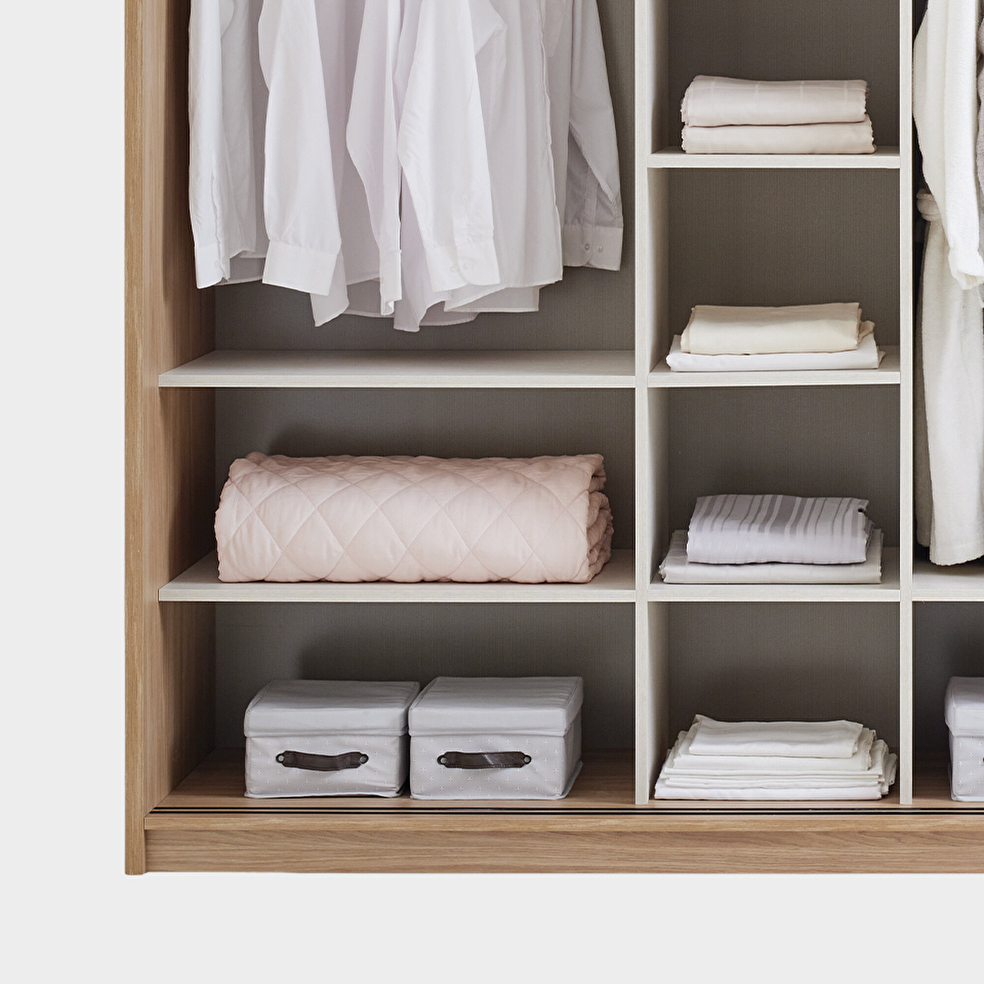 Natural and Elegant Combination PERGE SLIDING DOOR Wardrobe combines elegance and naturalness with its oak and textile textured cream color combination. This harmonious color transition adds warmth and a spacious atmosphere, while at the same time creating a sophisticated look. It reflects elegance in bedrooms with its modern wood texture and perfect harmony of cream tones.