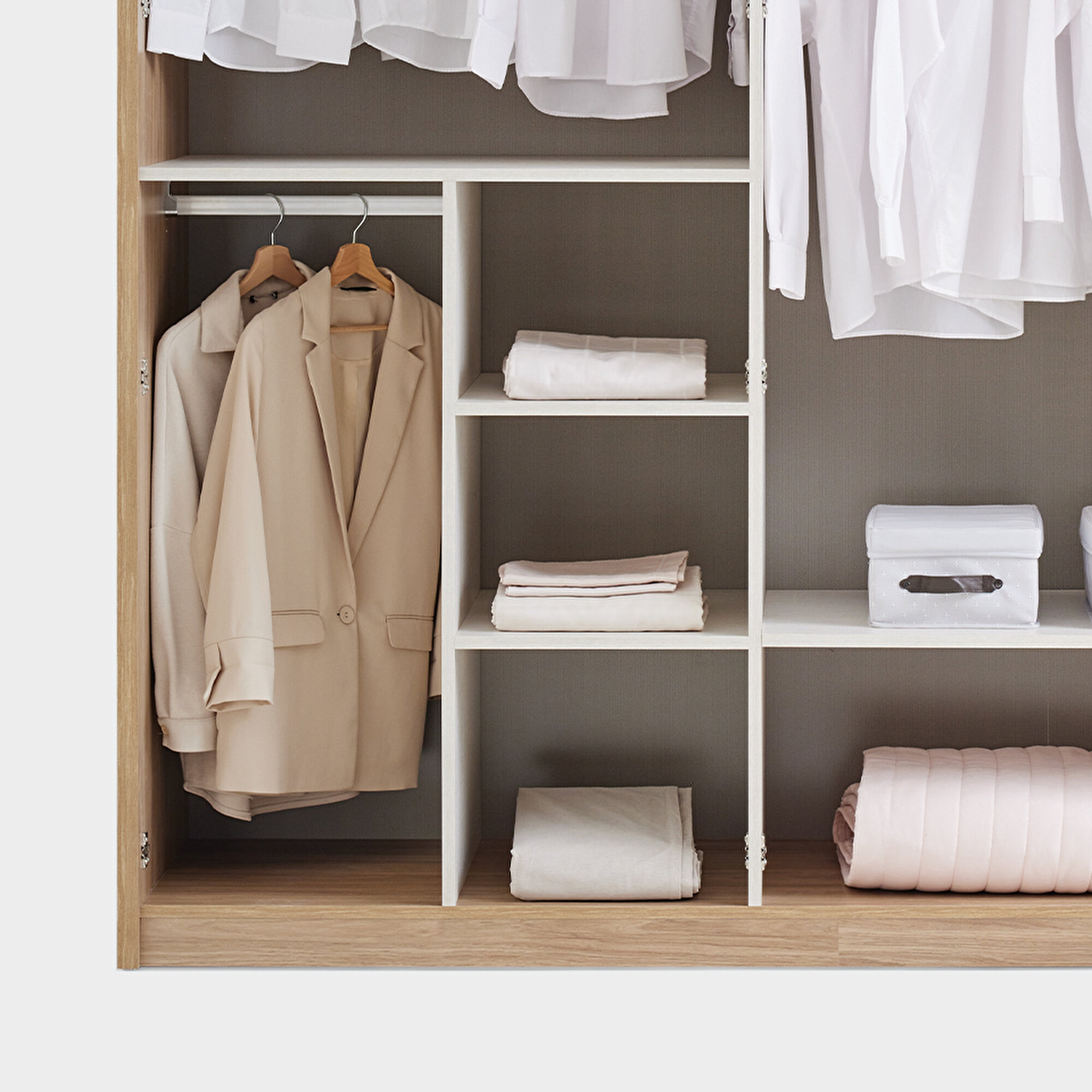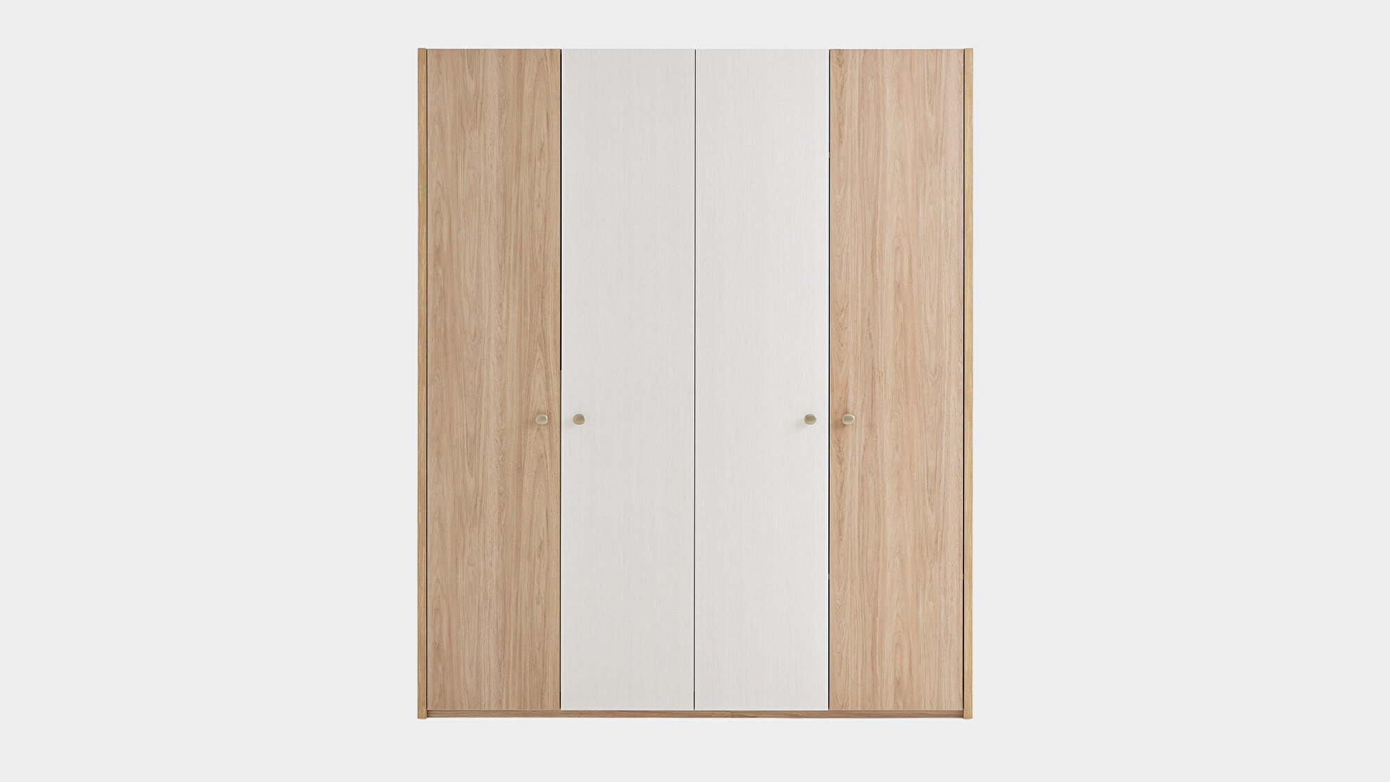 Oak and cream color harmony PERGE 4 DOOR Wardrobe brings warmth and elegance with the perfect harmony of oak and cream colors. Cream tones combined with textile texture strengthen the natural and sophisticated atmosphere of the wardrobe and add a natural freshness.