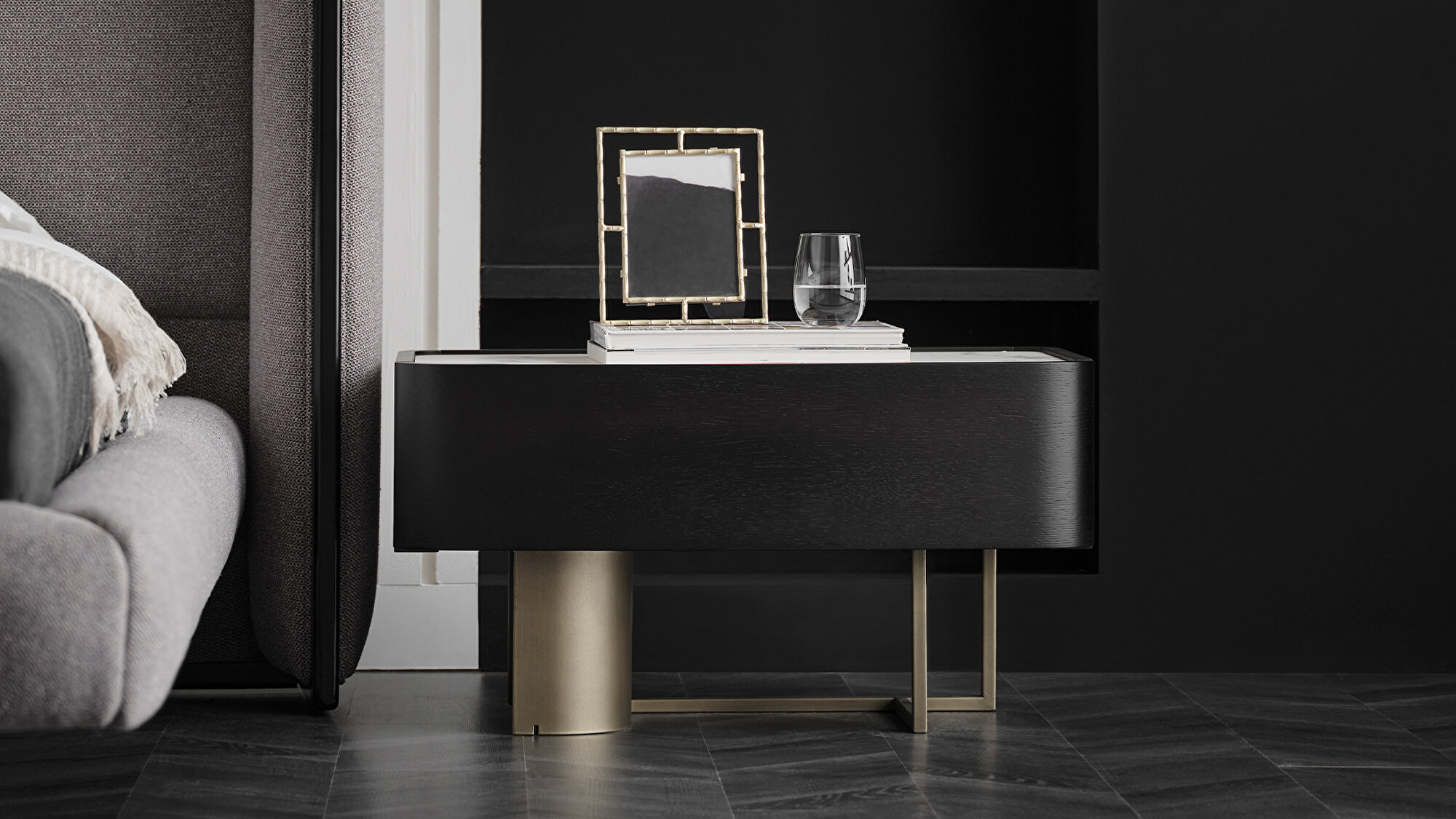 SUVA NIGHTSTAND is a product of the Visions Series and stands out with its modern rounded lines and elegant design. The top table offers a luxurious touch with its marble-like ceramic coating. The natural coating black color on MDF gives the nightstand an aesthetic and stylish look.