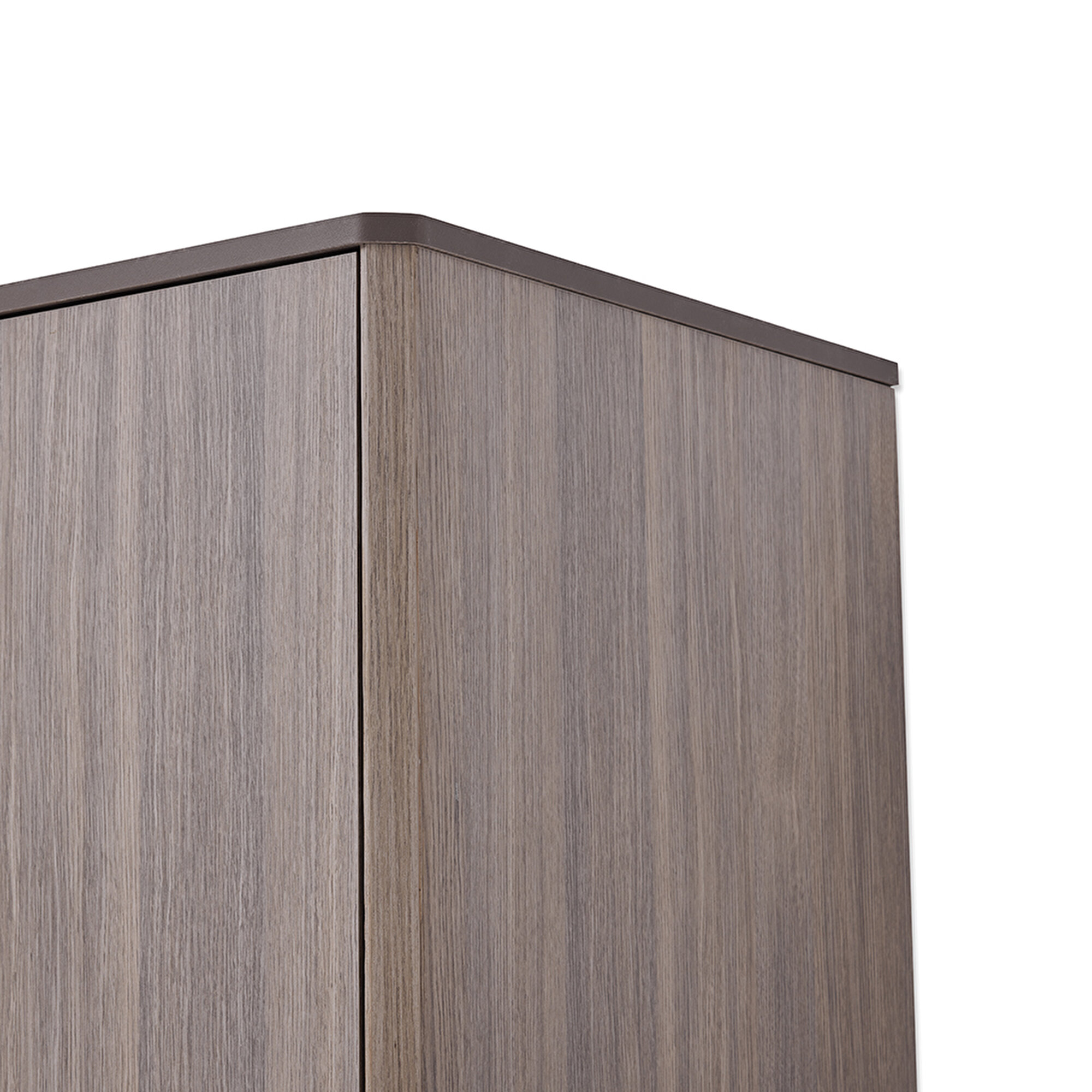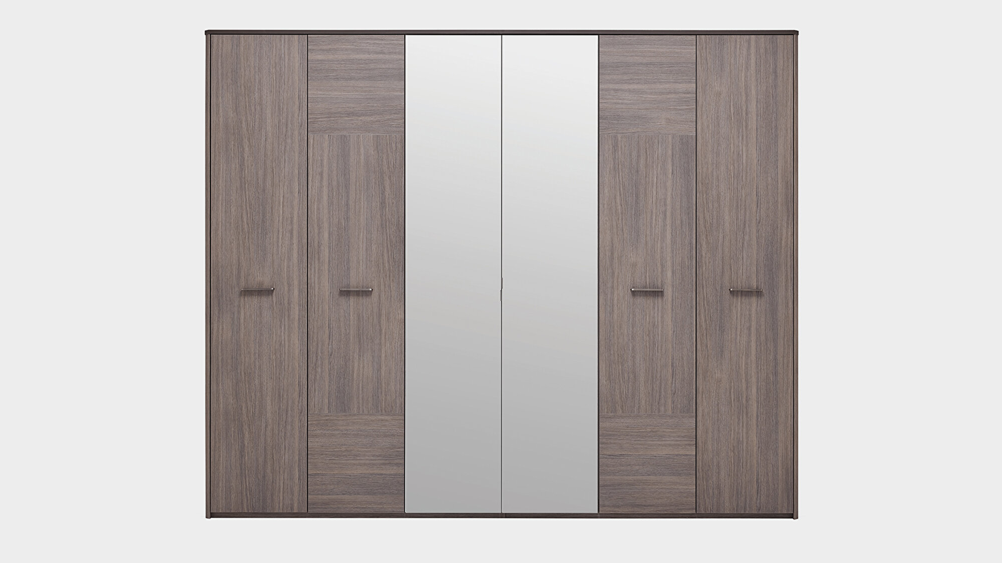 VARENA 6-DOOR WARDROBE creates an aesthetic setup with its special angled cut geometric form and motion sensor lighting application. The natural tone mirror application, which accompanies the oak and mink color combination unique to the series, stands out with its copper-colored metal handle design. 2 drawers and trouser racks create extra storage space.